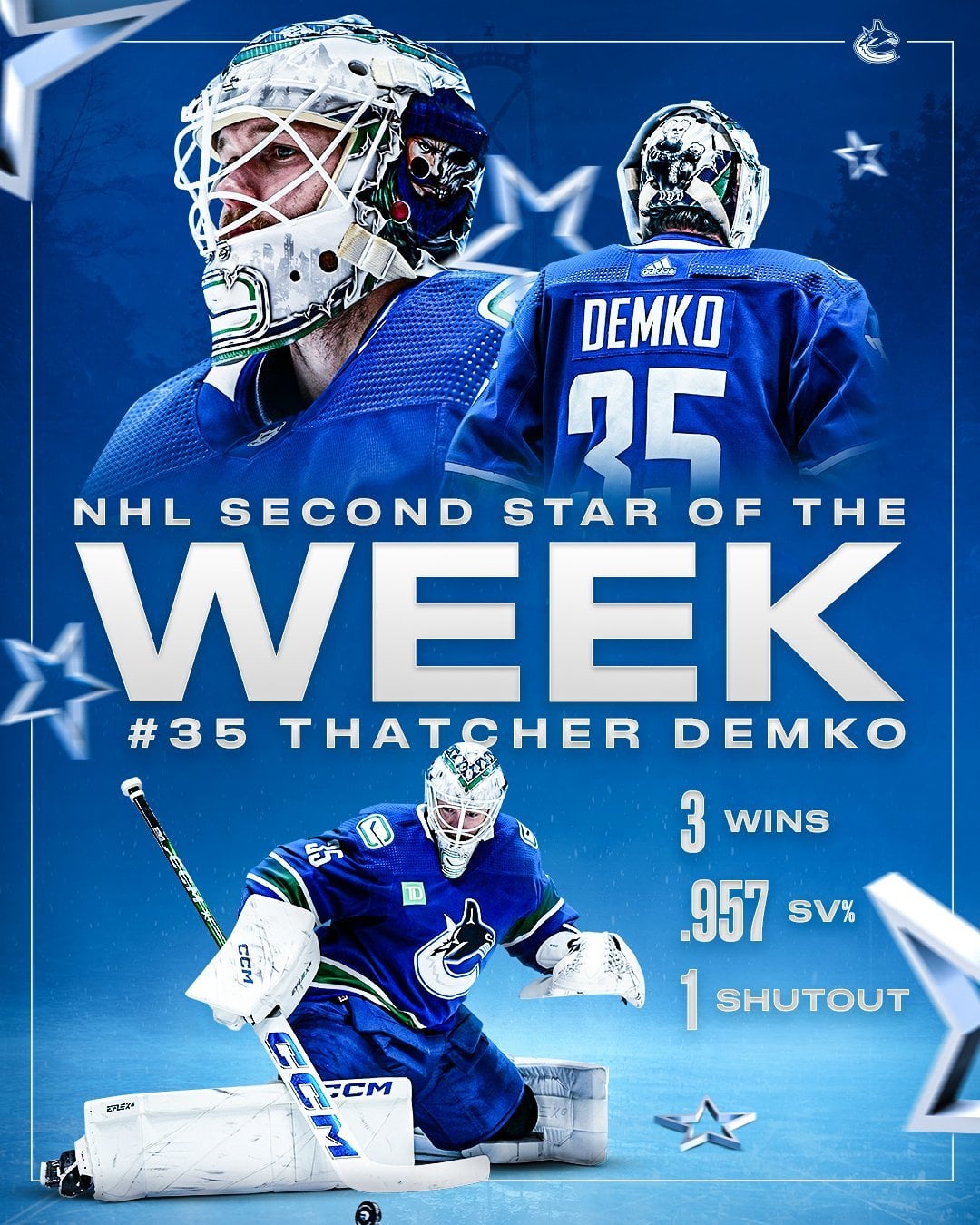 [Canucks] Backstopping the Canucks for all three wins last week, including a shutout performance versus the Panthers, Thatcher Demko is the NHL’s Second Star of the Week! 🌟