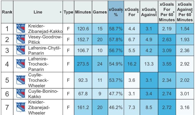 Notice how the line of Kreider-Zibanejad-Kakko has the least xGoals for per 60, but also gives up xGoals against at the lowest rate as well.