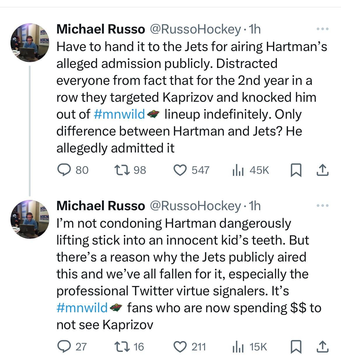 This is such a brutal take. Last year Kaprizov literally said it was just an unfortunate fall that hurt him. This year it’s a completely routine crosscheck and Kaprizov gives Dillion one back way harder right after but no one seems to be mentioning that. It’s unfortunate he’s been hurt two years in a row but it’s not like we’ve been going out of our way to do it, unlike some teams… say Minnesota? And to say the Jets are doing this to move the story away from themselves? Just brutal. Jets are doing this because this is the second time DoPS have shafted us. The takes coming out over this incident are blowing my mind. Don’t know how anyone can defend this play, the Wild, or Hartman in all this.