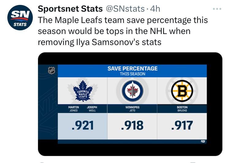*If we remove our starter who just got put on waivers because he’s been complete asscheeks, our numbers are best in the NHL….. In a way smaller sample size – @LeafsnetStats