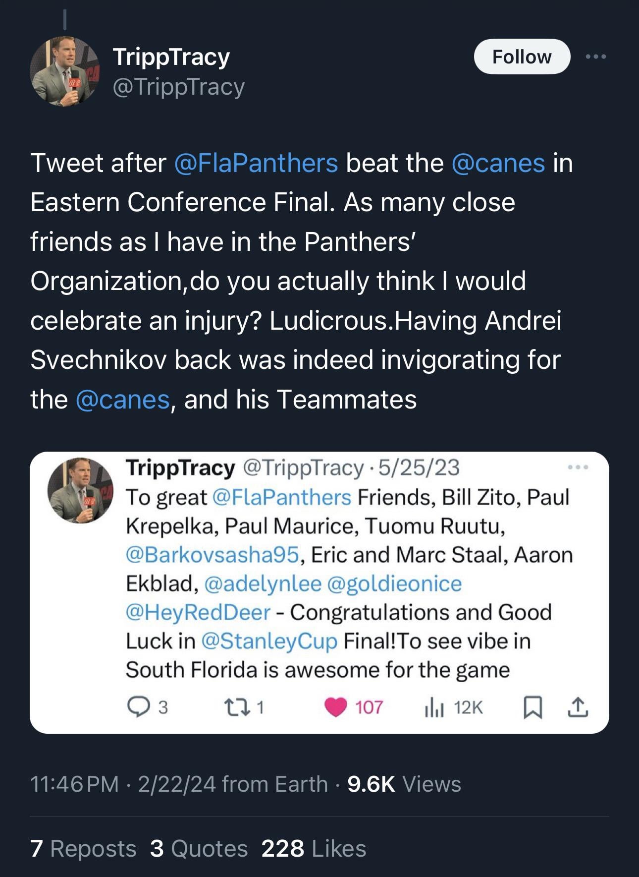 I think the fact that Tripp even had to say anything is ridiculous. It’s obvious as hell that he was talking about the hit itself and Svech’s willingness to bring such a physical play right to the doorstep of one of the most physical players in the league. As much as I dislike the guy, it’s unfortunate that Tkachuk picked up an injury off the play. As polarizing as he is, the NHL is a better league when he’s playing.