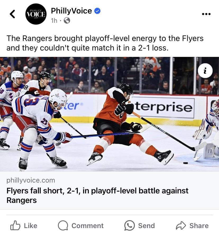 Mire like “Rangers brought no energy but the Flyers miss 5+ grade A chances.”