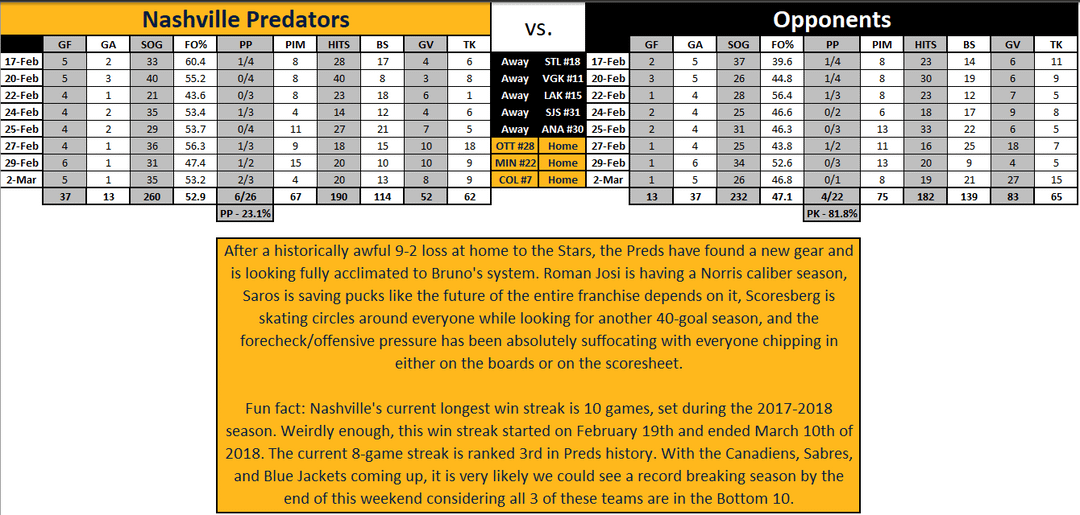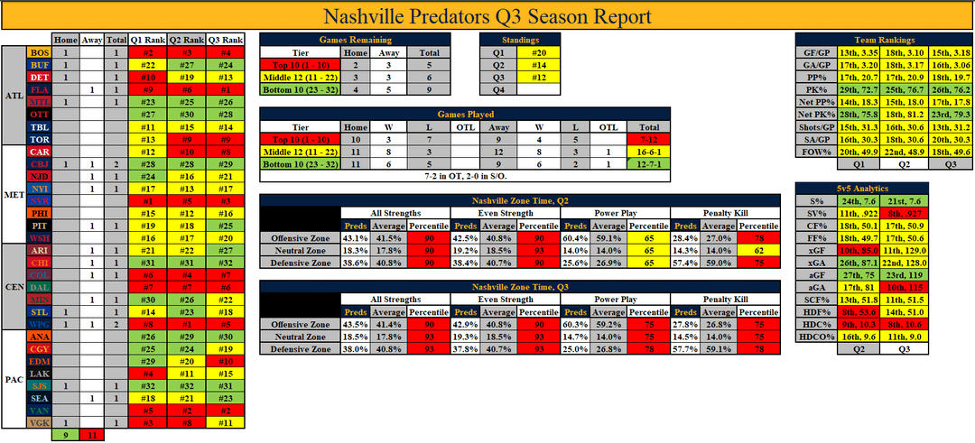 My favorite stat is that the Preds rank 3 positions higher in 5v5 shooting percentage than in Q2 with the same shooting percentage, but their save percentage went up from .922 to .927, so to some degree the Preds relative shooting percentage got better because Saros made the rest of the league’s worse