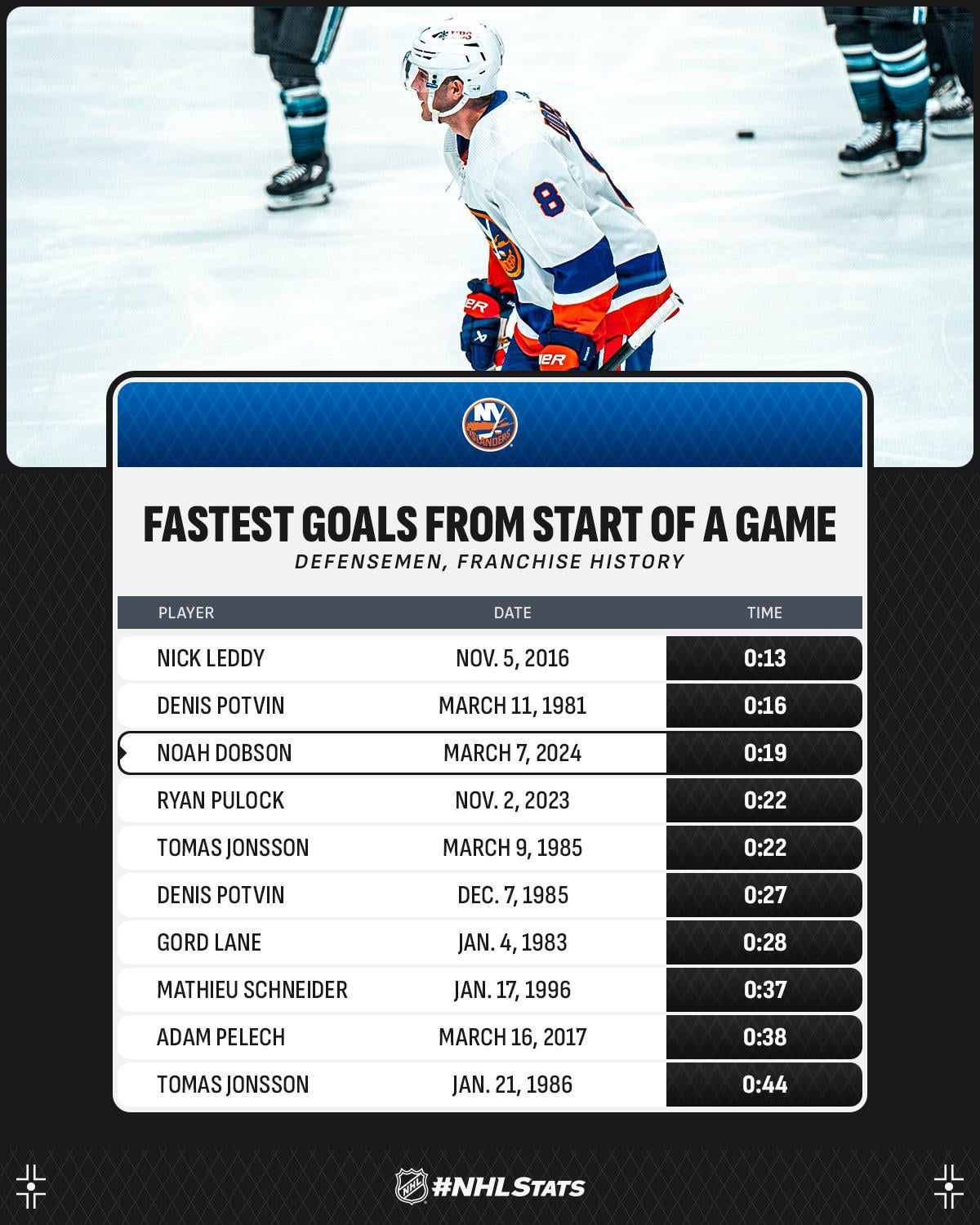 Dobson’s goal tonight was the third fastest goal to start a game by a defenseman in Islanders history by ianisms10 Eastern ConferenceMetropolitan DivisionNew York Islanders Prev Post The Winnipeg Jets Continue To Hold The Line While The Trade Deadline Action Heats Up March 8, 2024 Next Post Maple Leafs vs Boston Bruins LIVE POST GAME feat. Jay Rosehill | Game 63 REACTION March 8, 2024 5 Comments ianisms10 2 years ago [Per NHL PR](https://twitter.com/PR_NHL/status/1765958119966835035?t=sjyd-VTYJK2y6pAW0iqnPA&s=19) nothing_but_static 2 years ago And beats out Pulock’s goal from earlier this season ErnstBadian 2 years ago Fun list. We had so many good scoring D between 1996 and 2016, interesting that none of them make it. displacedreindeer 2 years ago Amazing how many times Dobber is getting on lists with Denis. He’s truly having an historic season! aaronwe 2 years ago anyone got a link for that leddy goal? 13 seconds in sounds like a cool highlight to seeWrite A CommentYou must be logged in to post a comment.