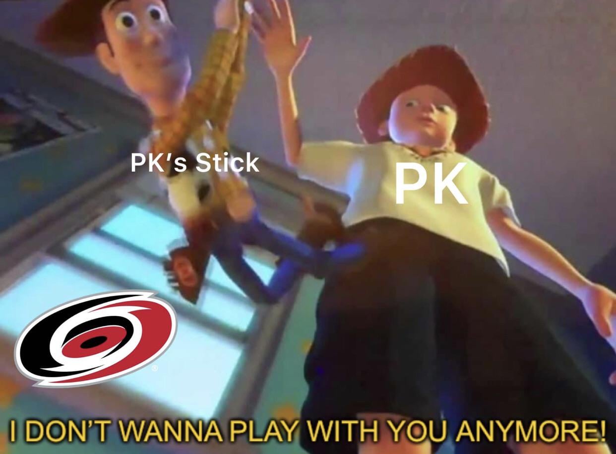 I cracked up during the Habs game when Freddie lost his stick and either Tripp or Mike mentioned that was was very different from usual, because PK plays without his stick all the time.