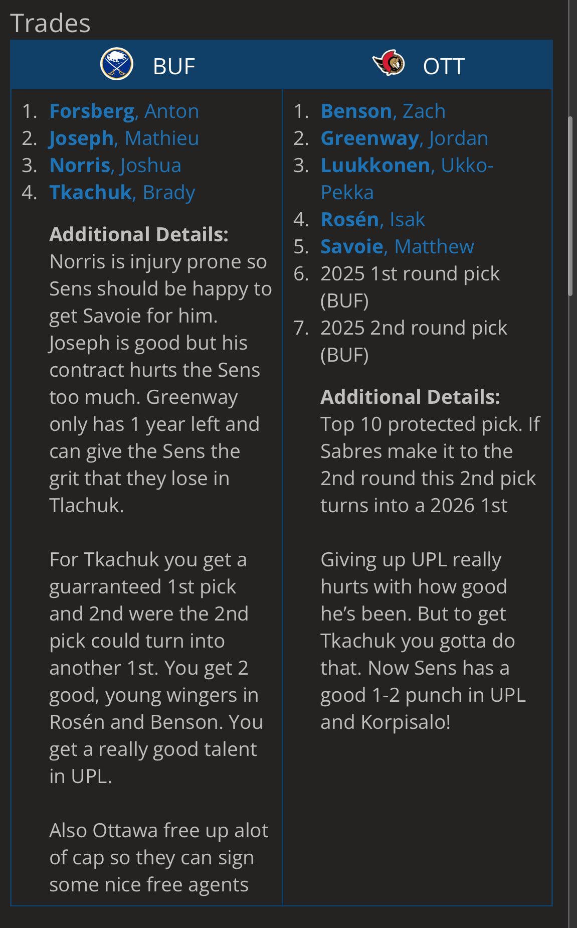 I mean I can be convinced to do Benson + Savoie + 2025 1st for Tkachuk, but I wouldn’t add anything else from Buffalo’s side unless Zub was in the offer from the Sens side.