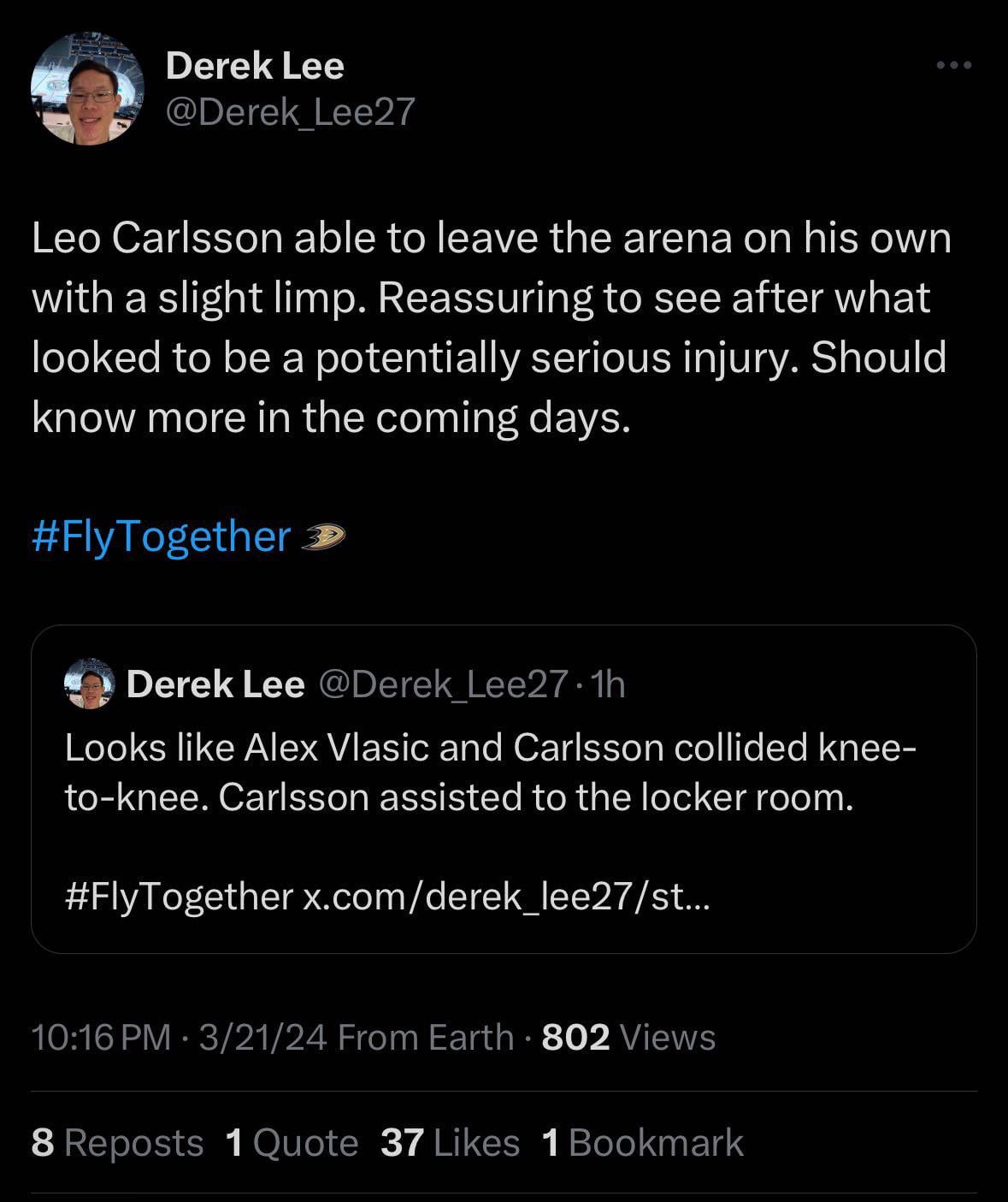 I know Hayward said it looked bad but I didn’t think so. The knee didn’t move awkwardly after the hit. Looked painful for sure but nothing affecting structure.