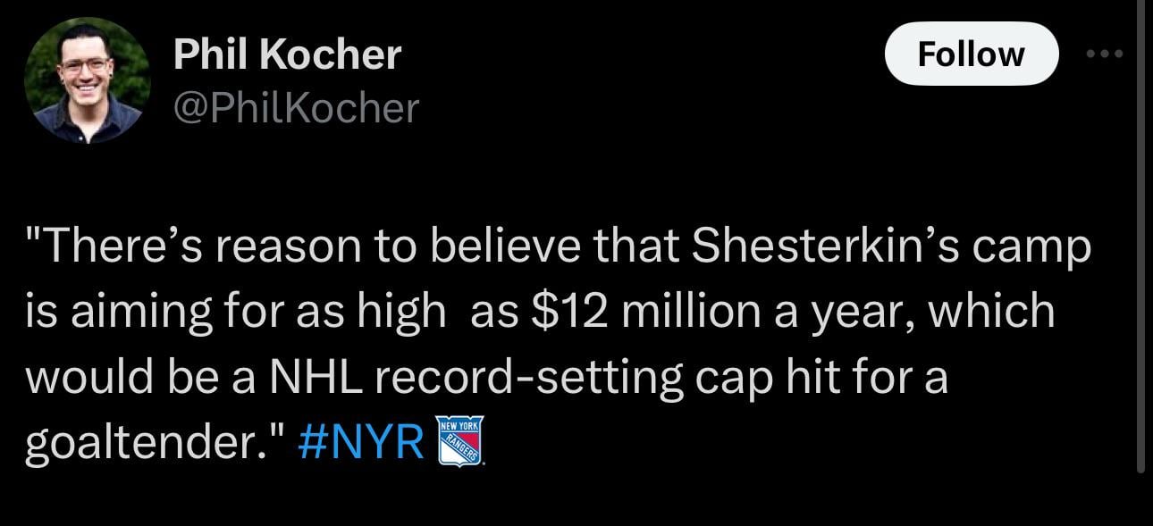 I think it’s very dumb to listen to nobodies on Twitter who say things without anything backing it up other than “there’s reason to believe…”. If it’s as simple as that, then there’s reason to believe that Igor wants to take a team friendly deal leaving millions on the table so that the team can have the cap space to bring in players to help him win what he really wants, which is the Cup. See? That’s how easy it is to make up nonsense.