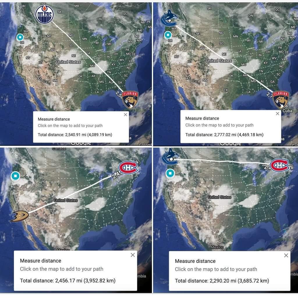 The Stanley Cup Finals have the furthest geographic spread between teams, with 2,541 miles between Edmonton and Sunrise. The furthest possible spread? That would be the Florida Panthers and Vancouver Canucks at 2,777 miles. For comparison, the Montreal Canadiens and Anaheim Ducks are 2,456 miles apart, while the Canucks-Canadiens spread within Canada is 2,290 miles. Canada is wide, eh?