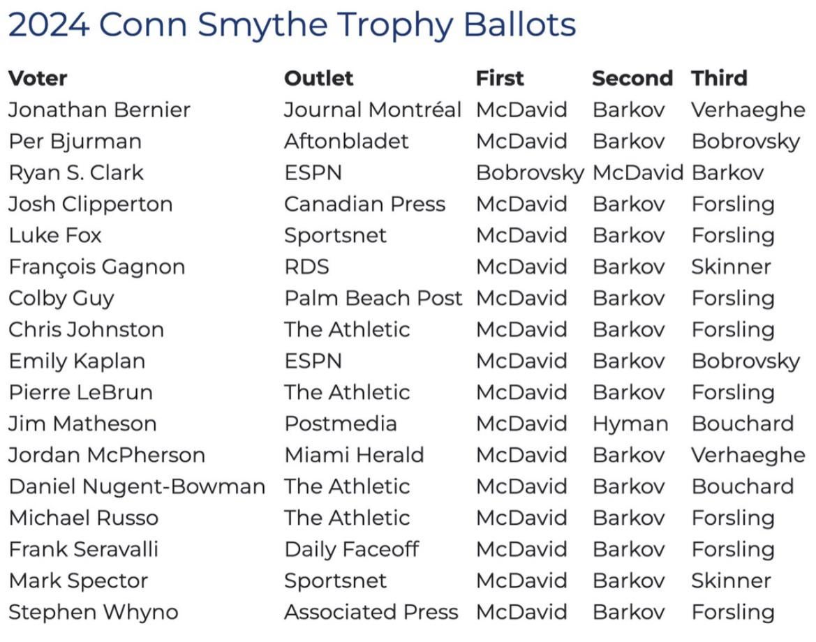 Interesting how the voting media would have given it to Barkov if not for McDavid. Much of the media I consume (ESPN/YouTube/Twitters) seemed to indicate that if anyone was most snubbed, it was Bobrovsky.