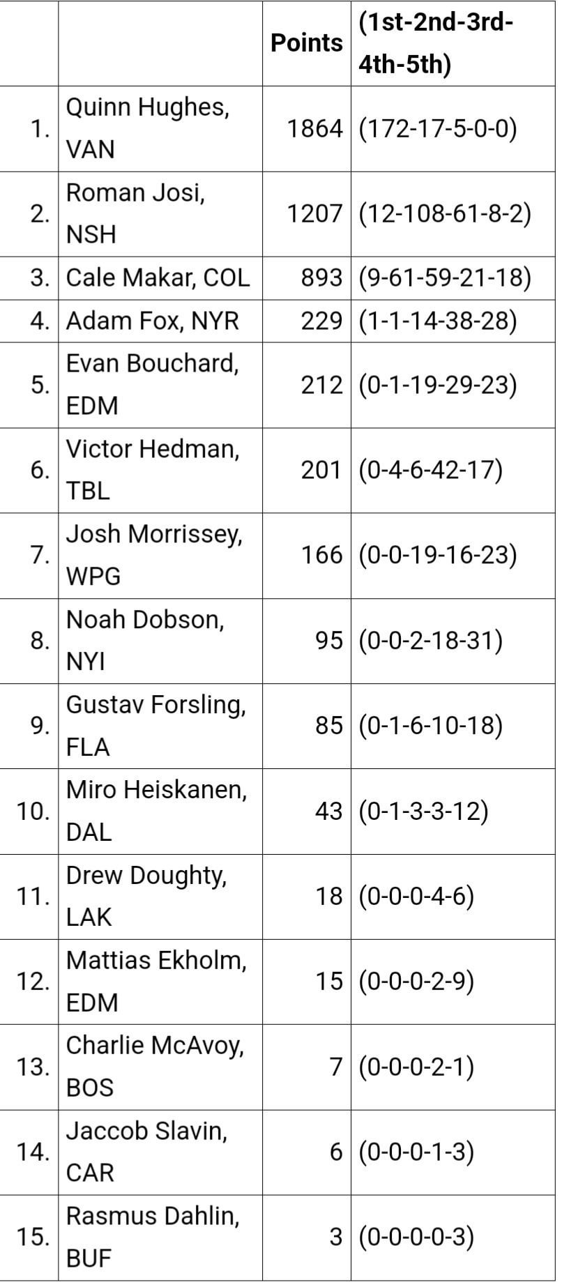 Bigger gap than I would’ve expected, and I definitely would’ve expected Makar at least number 2, but Hughes definitely deserved it. He played great all year