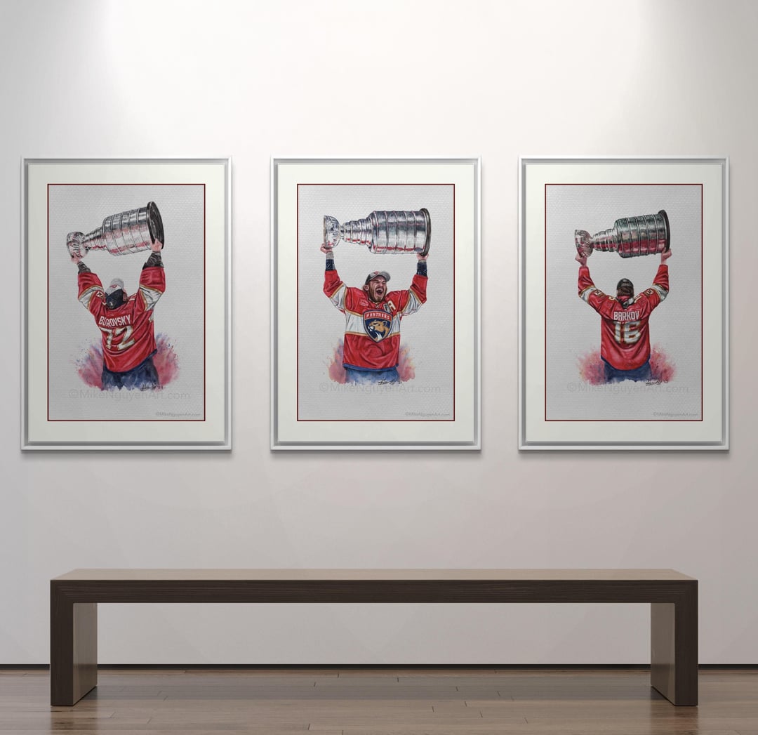 As requested by my Panthers fans π, Hereβs my latest watercolour painting of the Bob Ross With his 2024 Stanley Cup! This completes my 3 set or 4 with PoMo too. Hope you like it ππ Thanks π¨ MikeNguyenArt #TimeToHunt