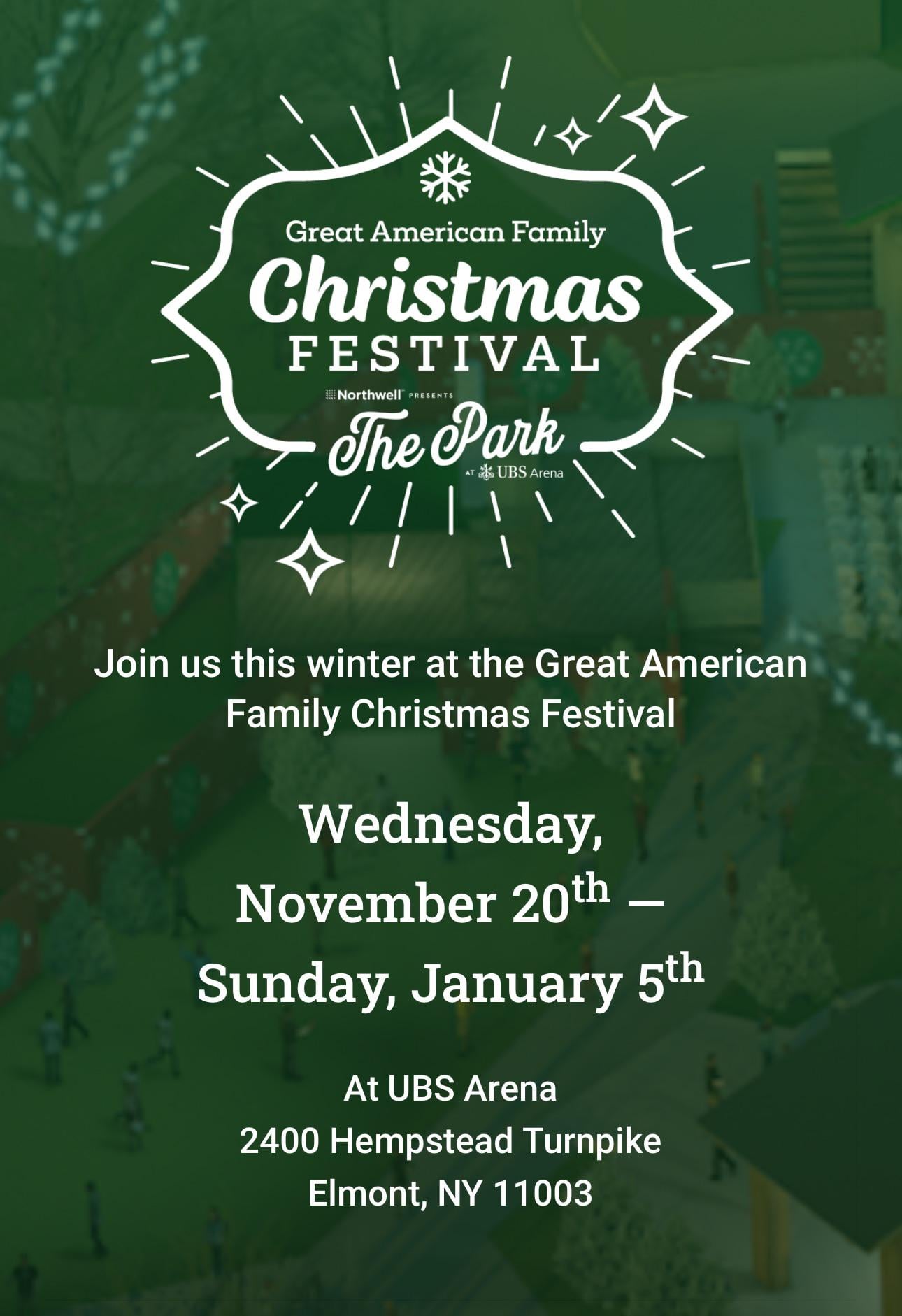Great American Family Christmas Festival at The Northwell Park at UBS Arena: a new annual holiday tradition from November 20 through January 5.