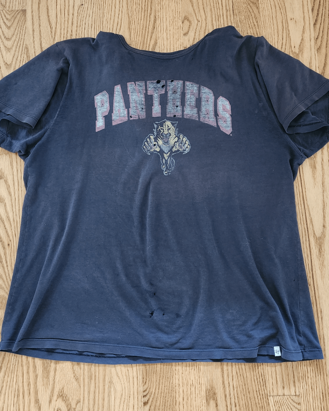 This shirt has lasted about 10 years of frequent wear and a few games before I bought my first jersey. Lasted a bit less than my 1996 stanley cup final white shirt I bought from Publix back in the day. Seems like a fitting time to properly retire this shirt from the rotation.
