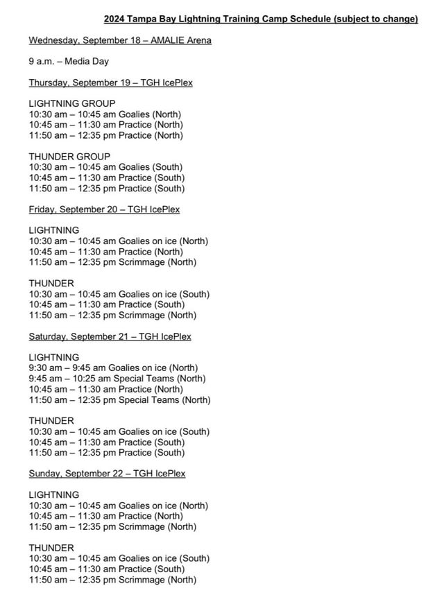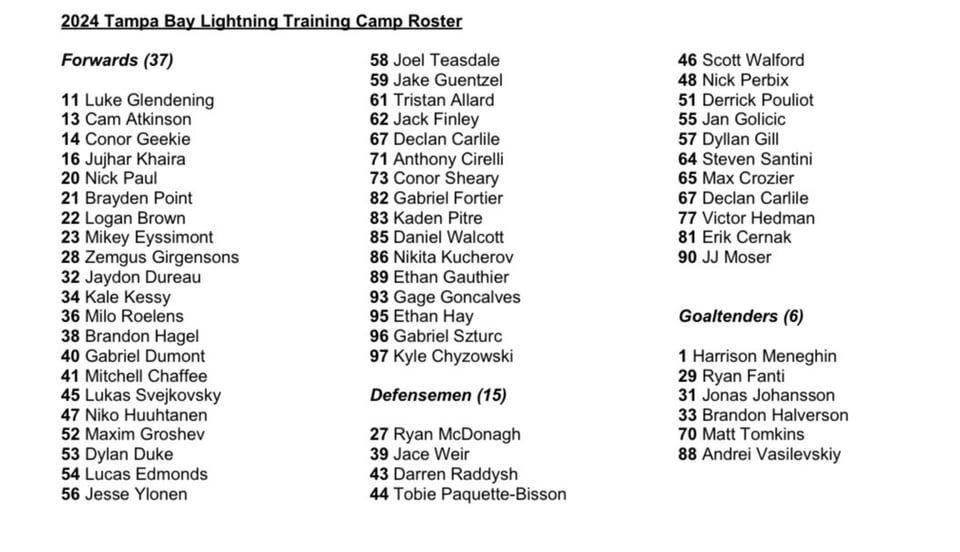Training camp begins this Wednesday, Sept 18th with media day, hopefully this year no one shows up with comments about how disappointed they are to still be unsigned 😅by dolewhiplash Atlantic DivisionEastern ConferenceTampa Bay Lightning Prev Post Danielson, MBN and more; Bultman’s notes on the Wings prospects games in TC September 16, 2024 Next Post Tyrese Maxey & Drew Hanlen Working to Improve Driving Angles #MicroSkills September 16, 2024 5 Comments dolewhiplash 1 year ago Emil Lilleberg is also on the official roster, he just got left of the picture version, also all practices at TGH Ice Plex are free and open to the public. [Per [Diandra Loux on Twitter](https://x.com/Diandra_loux/status/1835751076483710977?t=lWE09dgbw48QMDc1vk5C9Q&s=19)]Edit: The [roster](https://x.com/Diandra_loux/status/1835758627778707466) has since been edited, Lilleberg has been added and Carlile has been unduplicated, and both are under defensemen where they belong. GatorBolt 1 year ago I guess Kharia might be a PTO? I didn’t hear anything about that but maybe I missed it Enough-Register5313 1 year ago Declan Carlisle at Forward and Defense? 🤔 MouseRat_AD 1 year ago Oh man. Vasilevsky has to beat out 5 other goalies. I hope he makes the final squad this year. Switchgamer1970 1 year ago LGBolts.Write A CommentYou must be logged in to post a comment.