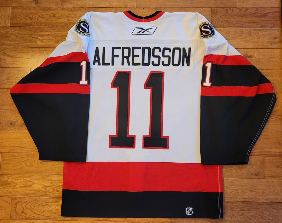 '06-'07 authentic on-ice (sz 46) Reebok away Alfredsson with authentic original run Stanley Cup Finals patch, customized by the Sens Store, fixed and additional details by FirstLineJerseys.