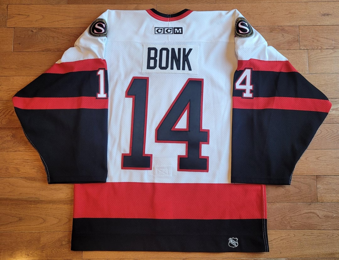 '03-'04 authentic on-ice (sz 46) CCM home Bonk with replica Neilson patch, customized by the Sens Store, fixed and additional details by FirstLineJerseys.