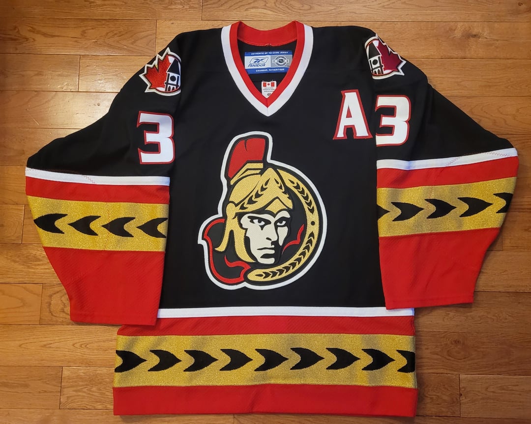The crest is as accurate as could be found since finding a retail authentic '02-'04 red or alternate jersey is nearly impossible, and any found will have the incorrect '00-'02 "tan" crest. The Sens wore 2