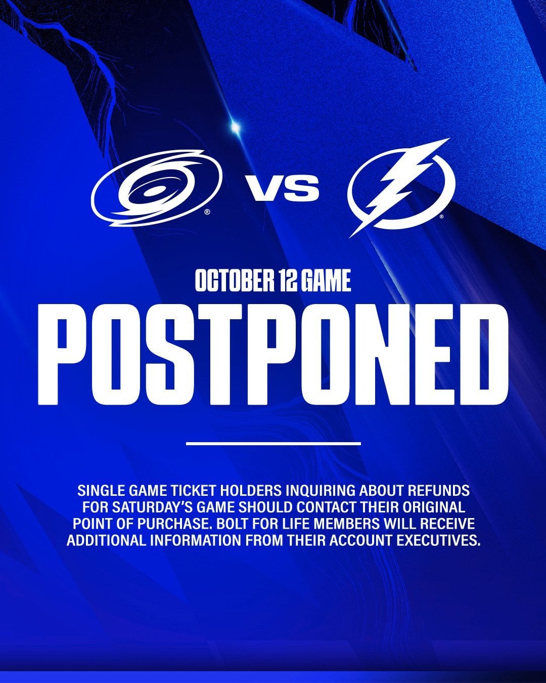 [Tampa Bay Lightning] Our game on Saturday vs. Carolina at Amalie Arena has been postponed as the Tampa Bay region recovers from the effects of Hurricane Milton. A new date will be announced at a later time. Our thoughts are with all those affected. π