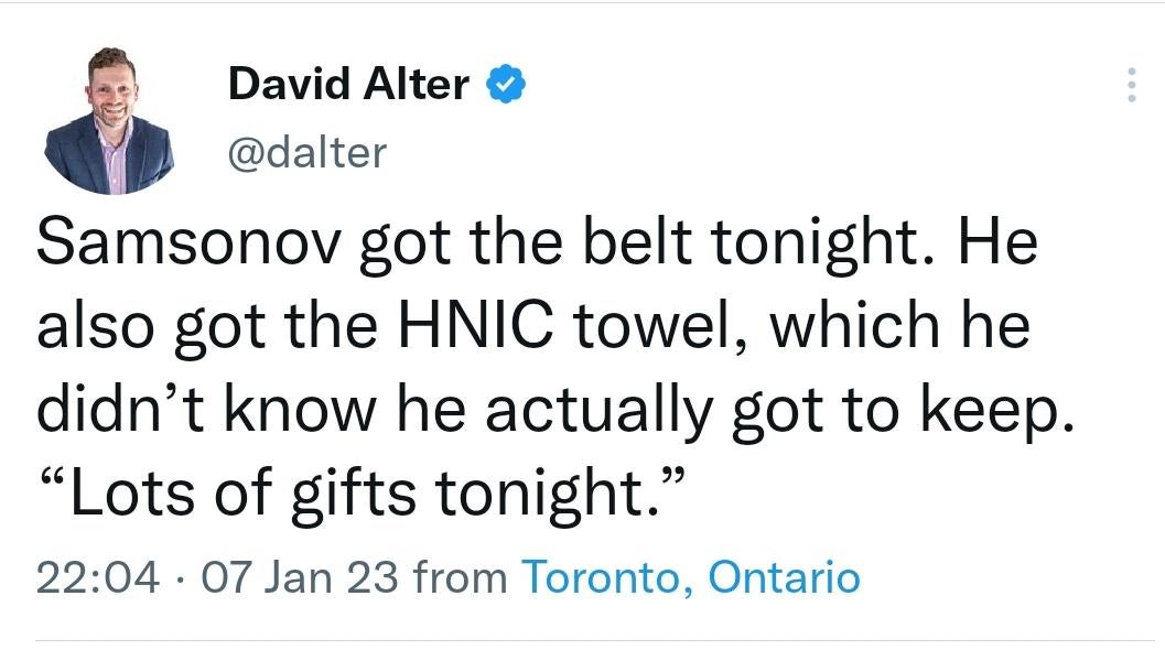 Sammy got the belt tonight! by DubTO Atlantic DivisionEastern Conference Prev Post Minnesota Wild vs. Buffalo Sabres | Full Game Highlights January 8, 2023 Next Post Kraken @ Senators 1/7 | NHL Highlights 2023 January 8, 2023 6 Comments _circa84 3 years ago I love how a simple towel is still so cherished by the pros, even after they’ve made millions and already have one ltDoBeLikeThat_ 3 years ago I fucking love Samsonov. He is so funny sansaset 3 years ago deserved. Murray is this subs fan favorite but Sammy has been the better goalie this season and it’s not even close. BornIn67 3 years ago A return to early season Samsonov. His only real error, and he paid for it, was not warning his teammates that the penalty was running out on Detroit. Goorlami 3 years ago What does HNIC stand for? SnooBooks9137 3 years ago Bunting is probably gonna get paid by another team this summer. Should focus on getting this beauty locked up Write A CommentYou must be logged in to post a comment.