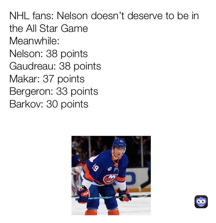 its a popularity contest…ryan “2 minutes of ice time” reaves has a better chance of making it than any of our other guys. surprised nelson made it pretty sure nhl only knows sorokin and barzy on our team