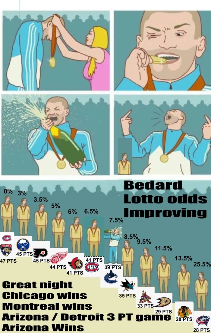 As a Canucks fan I’m fully prepared for them to jump Montreal, Ottawa, Detroit and Philly at some point. Especially with Demko (if he returns to last years form) coming back and the coaching change that will magically spark them to go on a dumb winning streak. Then after that they might lose 3 in a row, win two, rinse and repeat. I hope this team surprises me with an unreal tank performance in the 2nd half of the season but as a Canucks fan I’m prepared for the worst. They did good by going 2/10 on the road trip, hopefully they can keep that up.