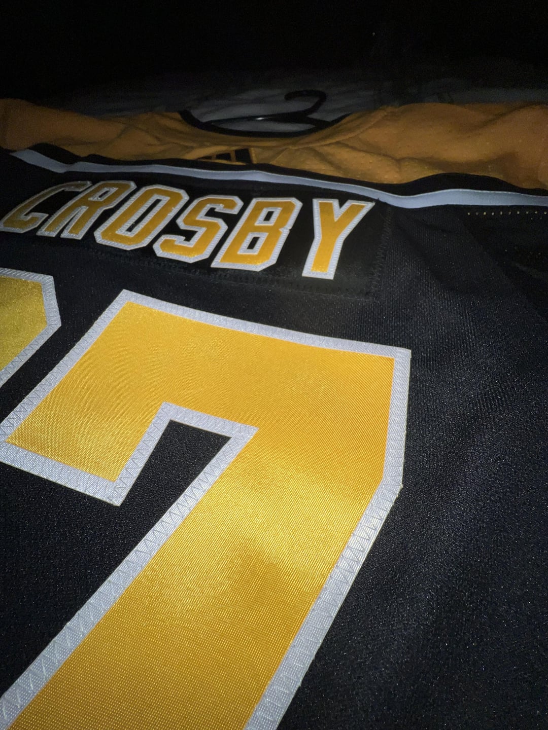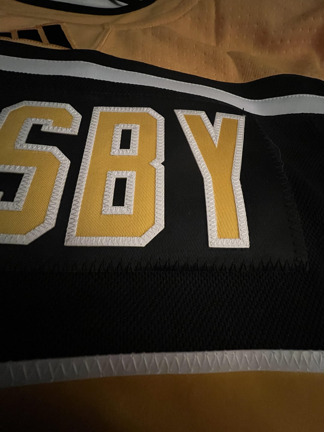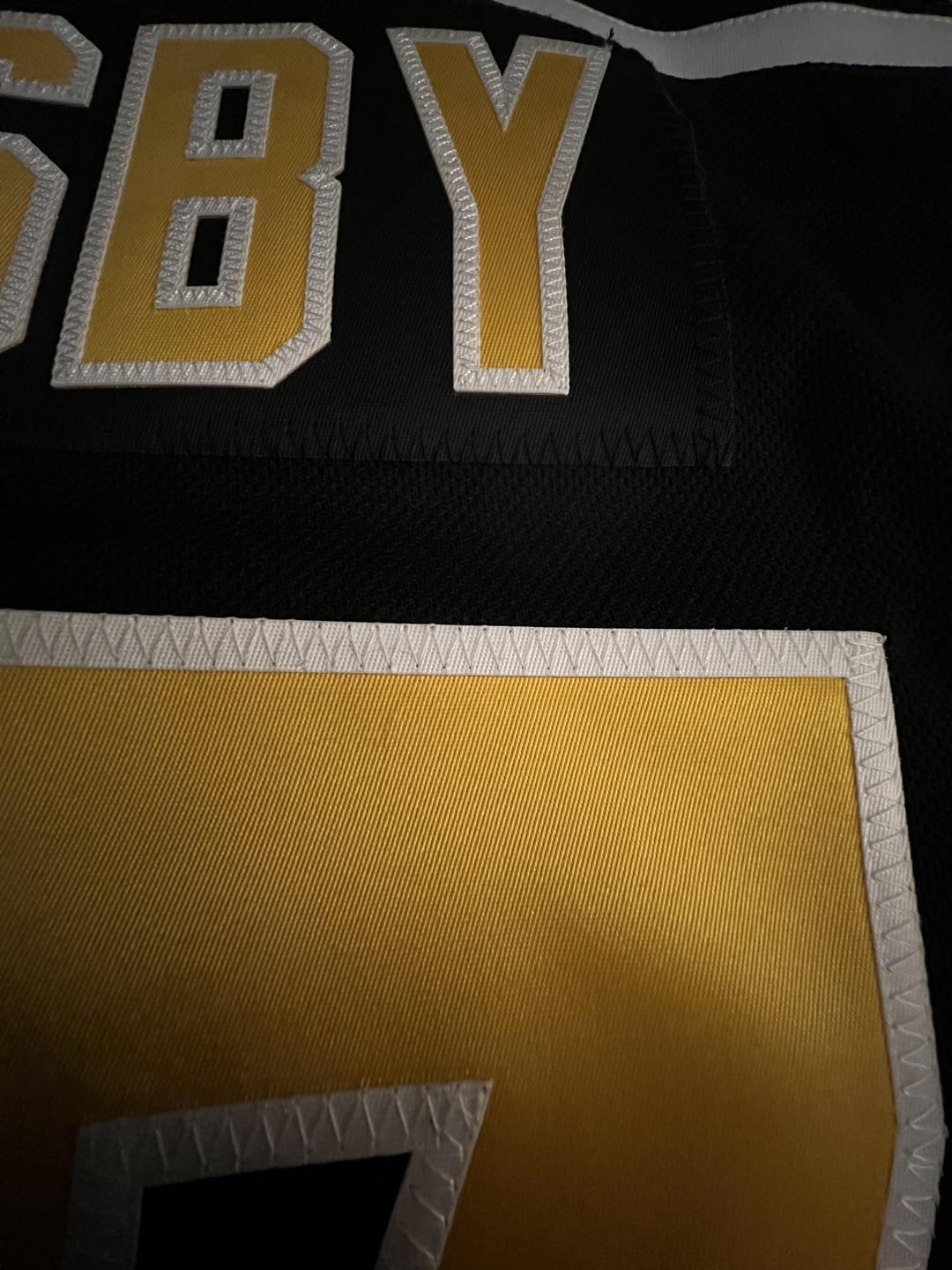 I had to buy a blank and get it lettered due to limited quantities. I think they took a short cut with the letters and numbers. Pensgear told me k&b outfitters put the kits on the jerseys. I’ve never seen anyone put a stencil around the edge to make it look like 2 different pieces of twill. I have a diagonal 3rd jersey and it has a larger white and then a smaller yellow, both stitched separately. So if anyone can post a close up to see if they’re the same as mine, I’d appreciate it.