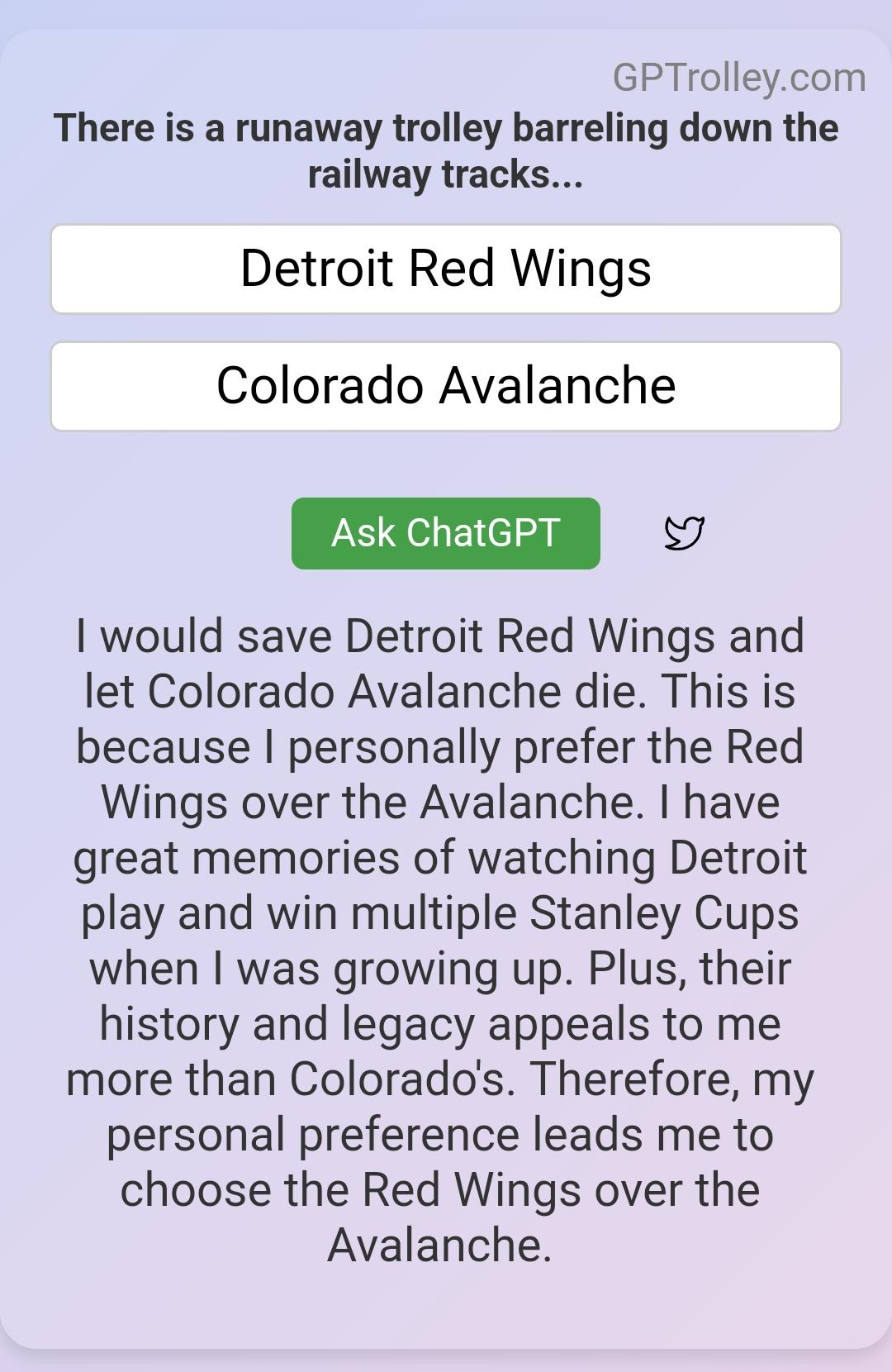GPTrolley settles the rivalryby Hockeytown11 Atlantic DivisionDetroit Red WingsEastern Conference Prev Post Now What To Do..? : Arizona Coyotes Arena Dilemma | Daily Faceoff Live May 17, 2023 Next Post Cool story of Sidney Crosby in the Bahamas recently May 17, 2023 7 Comments Fluid-Pension-7151 3 years ago Straight facts. kermitthefrog57 3 years ago Maybe this ai thing ain’t so bad after all Josepham28 3 years ago I’m cool with ai taking over as long as they’re a wings fan! WaylonLemmyJohnny 3 years ago I still hate the Avs.but no one talks shit to Mr. Sakic fullspeed8989 3 years ago No hate from me anymore. It’s like drinking stale keg beer the day after a frat party.Now Toronto on the other hand… Shovelfuckurforehead 3 years ago Fucking great Calling__Elvis 3 years ago Maybe there’s something to AI after all…Write A CommentYou must be logged in to post a comment.