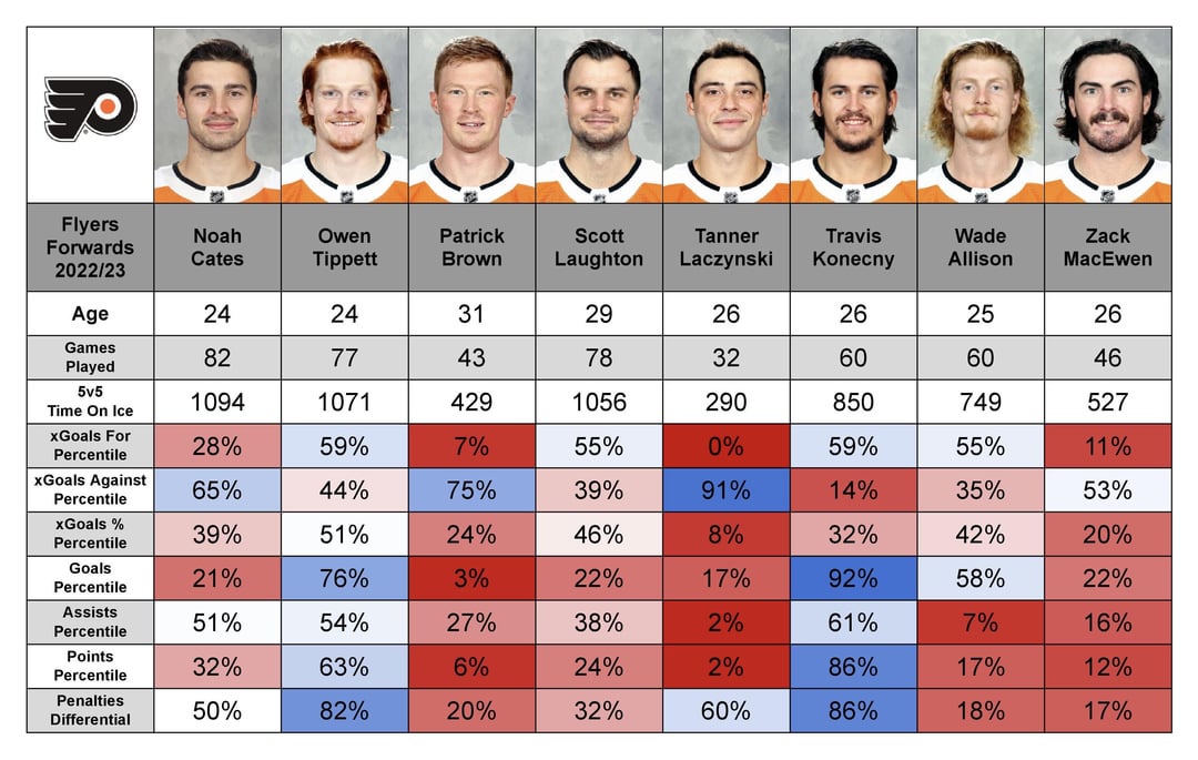 Frost has pretty amazing stats considering his first half of the season was rough. Tippett is going to go off with a proper center. Cam York passed the eye test and these stats show he’s the real deal. Seeler is a great depth dman. And I personally don’t wanna trade Konecny but if we do we’re gonna need a lot of good picks and prospects