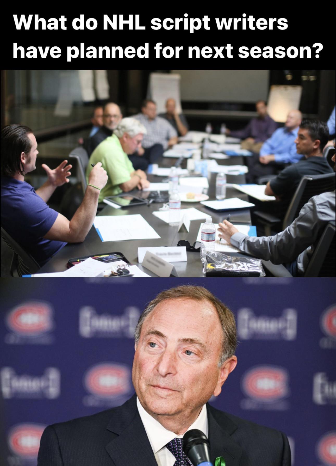 This week the writers are scripting the timing of penalties called against Canadian teams during the regular season. The “who gets the wildcard spots” script meetings are scheduled for next week. The Stanley Cup script meetings are not being held until after the draft. Plus we’re all scabs crossing the picket line of the writers strike. So we have to meet incognito. It’s a lot of work to script the entire season bro.