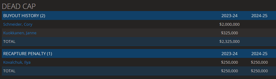 Additionally, we only have 2 more years of the cap recapture penalty from the Kovy contract. That’s only 250k, but cap is cap. Given the expected cap increases coming up in the next couple years, getting this extra cap back as well is a huge plus for us.