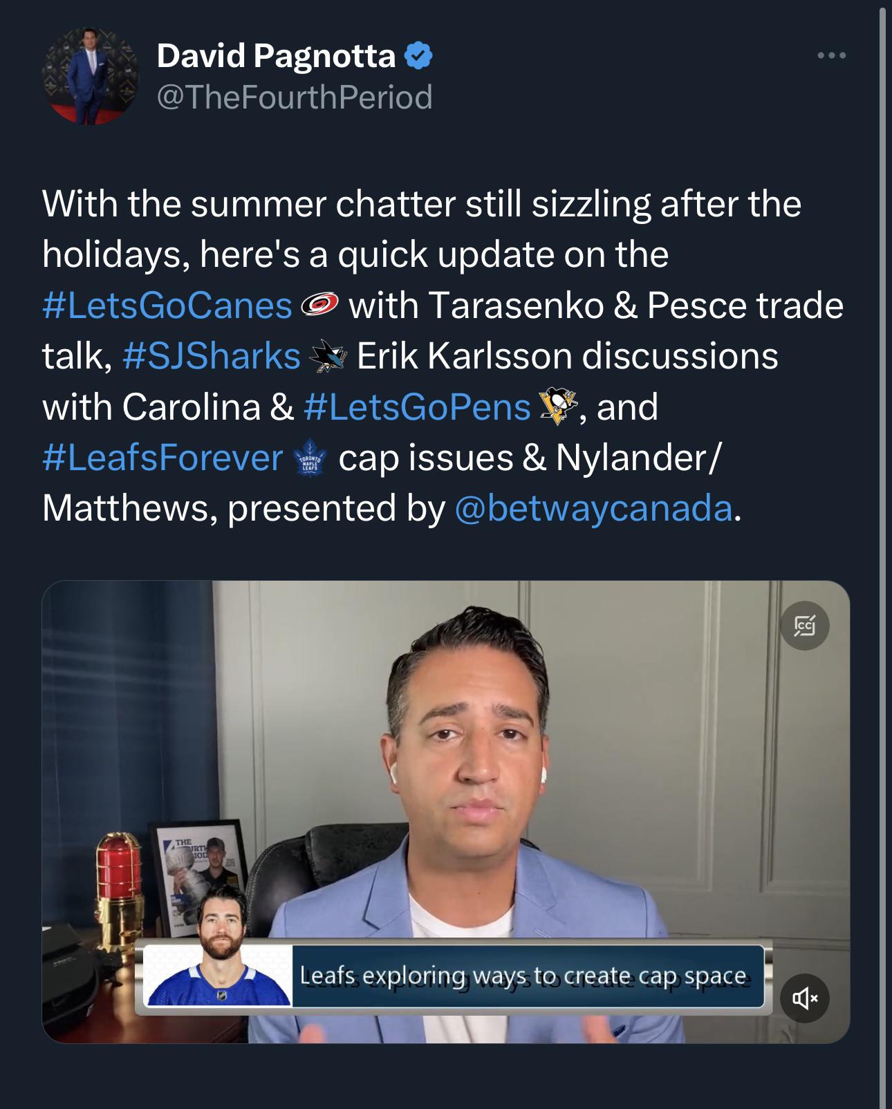 With the summer chatter still sizzling after the holidays, here's a quick update on the #LetsGoCanes with Tarasenko & Pesce trade talk, #SJSharks Erik Karlsson discussions with Carolina & #LetsGoPens, and #LeafsForever cap issues & Nylander/Matthews, presented by @betwaycanada. pic.twitter.com/s8ckHkhKQM