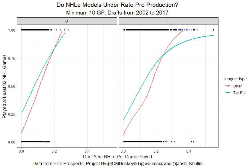 >[One interesting finding from this piece ended being the relationship between prospect production and NHL production is weakest when evaluating pro league defenders, so the cohort of prospects like Dimitri Simashev are the prospects NHLe models are most likely to miss on](https://twitter.com/CMhockey66/status/1676356028609200129)