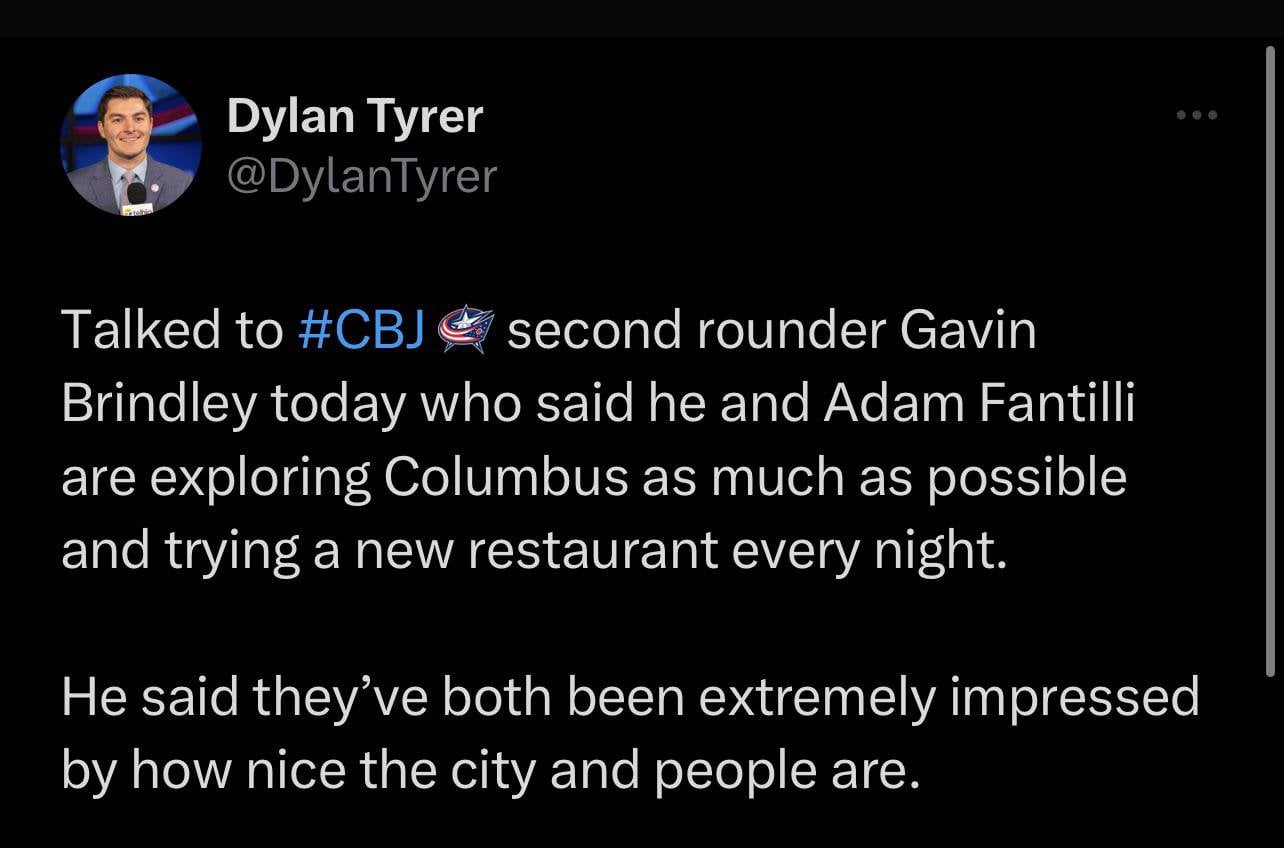 | 30 | [3 comments](/r/BlueJackets/comments/14m7wtz/gavin_brindley_welcome_to_the_columbus_blue/) | [Gavin Brindley – Welcome to the Columbus Blue Jackets](https://youtube.com/watch?v=hz_tNaBcUbQ&feature=share)|