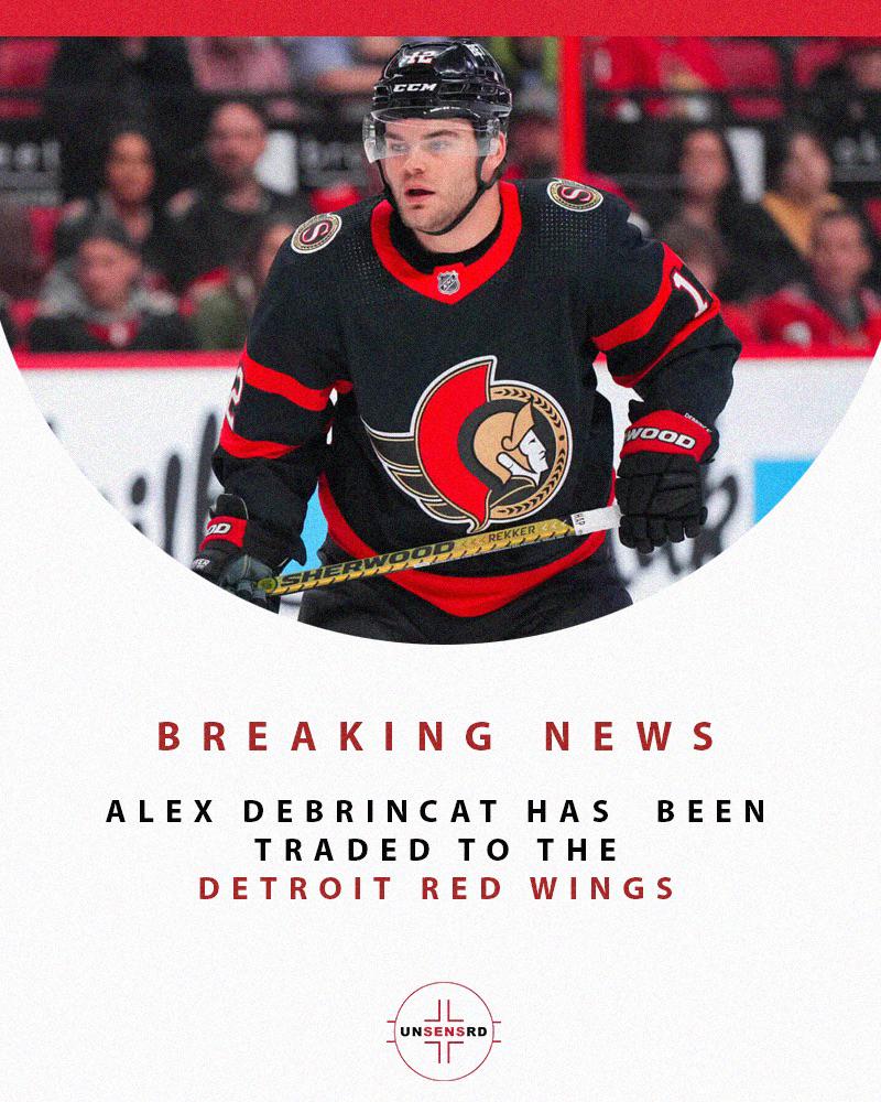 Edit: [Here’s the conditions on that 1st round pick they traded:](https://www.nhl.com/senators/news/ottawa-senators-acquire-two-players-two-draft-picks-from-detroit-in-exchange-for-alex-debrincat/c-345282564) The initial condition on the first-round pick is as follows — the Red Wings will have the option of sending their own 2024 first-round pick or Boston’s 2024 first-round pick (previously acquired on March 2, 2023) to Ottawa. However, if the Bruins’ 2024 first-round selection is an eventual top-10 pick (following the annual draft lottery), Boston will have the option of retaining the pick and transfering its 2025 unprotected first-round selection to Detroit. The Red Wings will then have the option of sending that draft pick or their own first-round pick in 2024 to the Senators to complete this trade.