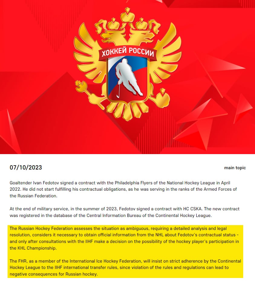 [Hockey News Hub] FHR statement on the situation with the CSKA contract of #FueledByPhilly Ivan Fedotov: