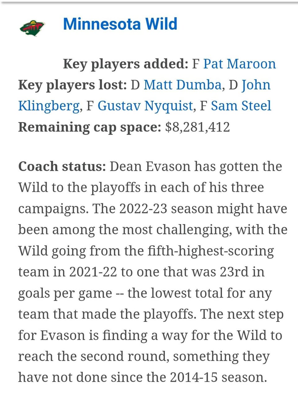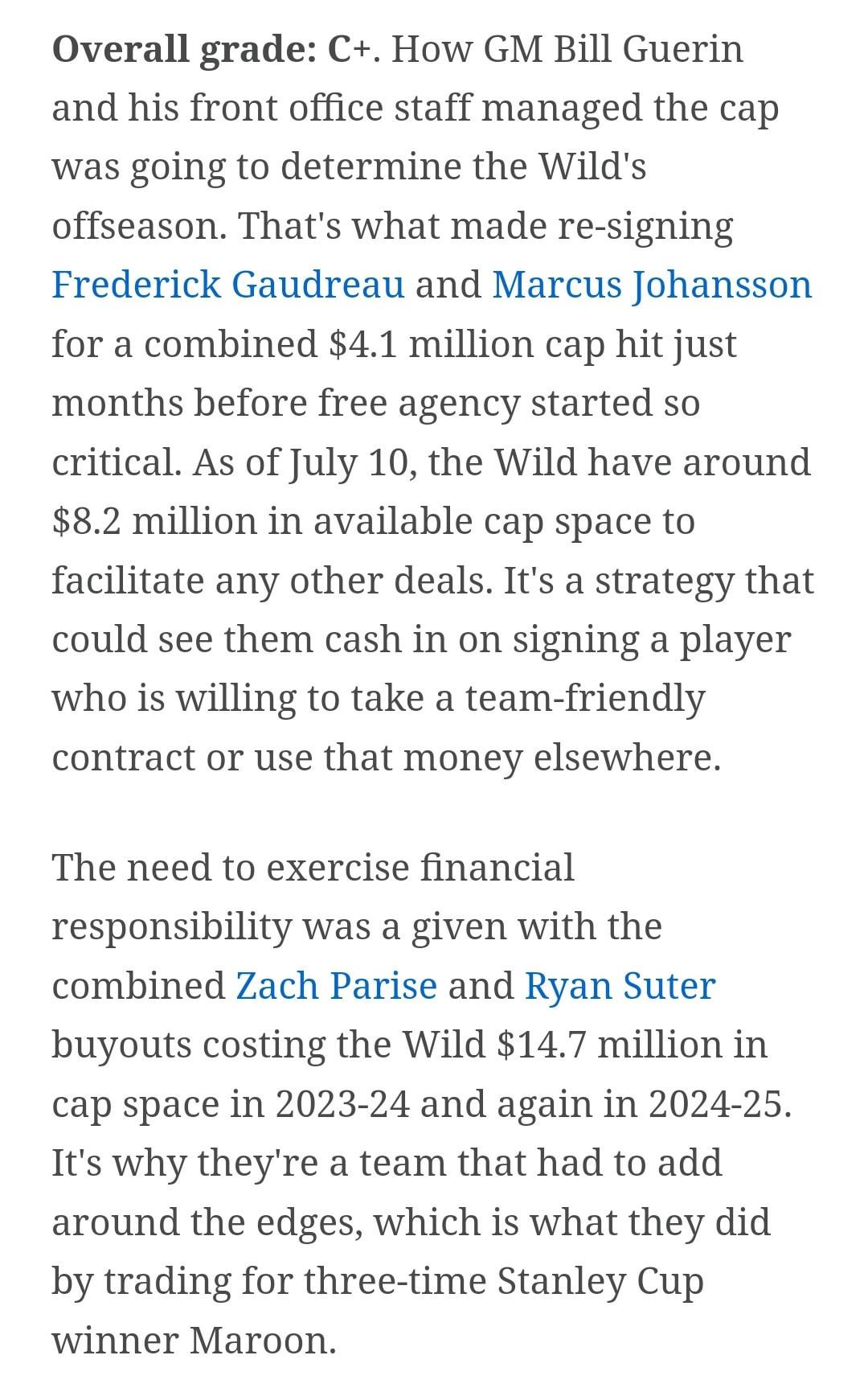 ESPN+ gives wild offseason a C+, fails to state what more Billy G could have done.by Mr_DR_1 Central DivisionMinnesota WildWestern Conference Prev Post What a move by New York Islanders winger Hudson Fasching.Catch Da Beauty League on FloHockey #isles July 13, 2023 Next Post Is Oilers’ forward group set for next season? Could they still add a big-name defenceman? July 13, 2023 1 Comment Mr_DR_1 3 years ago Further we still have to resign the Gus Bus and maybe Duhaime so we don’t really have $8.2 million.Anyhow, did anyone else enjoy reading this premium, pay wall material?Write A CommentYou must be logged in to post a comment.