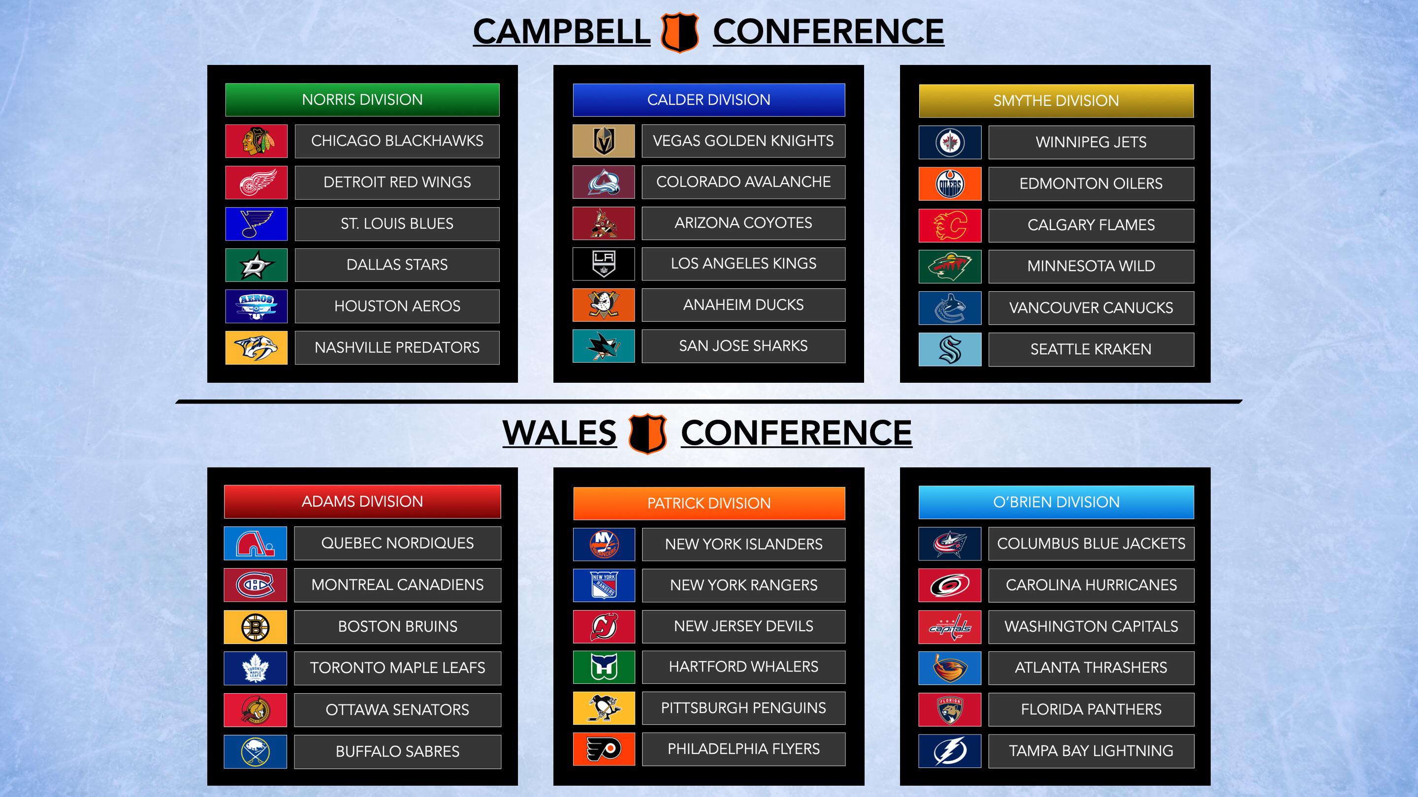The NHL and it’s divisions if they expanded to 36 teams (Houston, Atlanta, Hartford, Quebec), and went back to the original names.