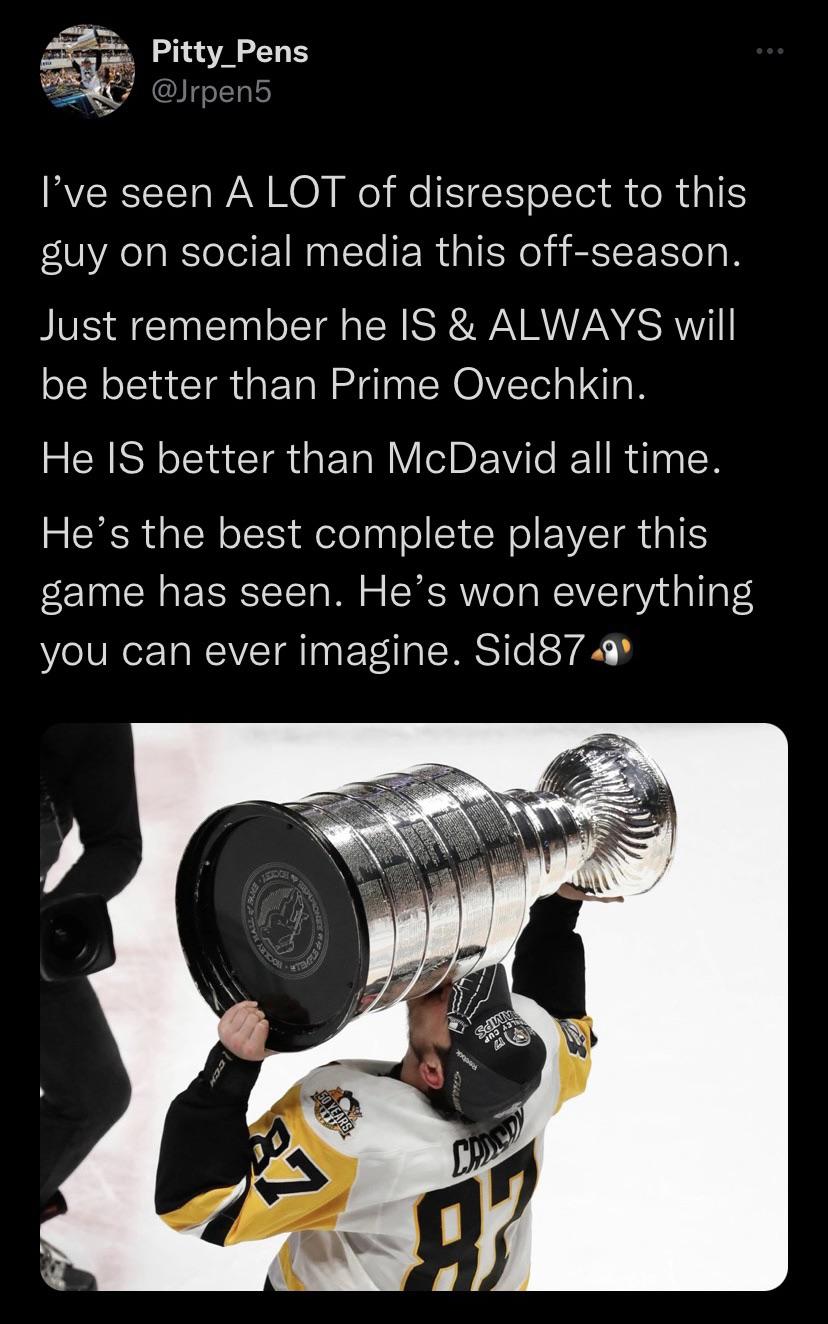 Yikes guy. I’m a huge pens fan. But the reality of overall GOATS. Crosby is after Mcjesus even without cups. Mcdavid does things in a era when the overall athleticism and talent has never been greater. To say otherwise is just peeing into the wind.