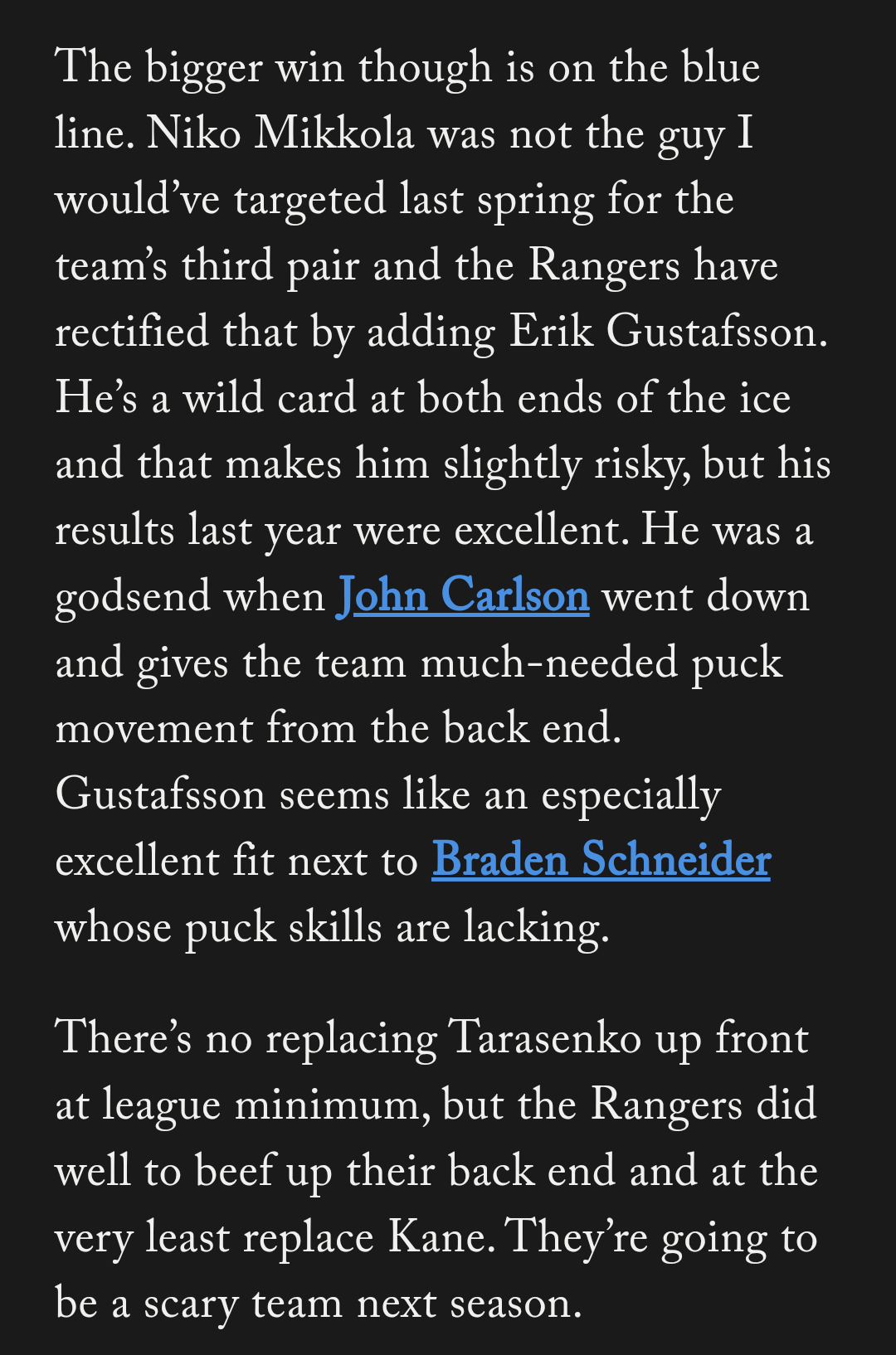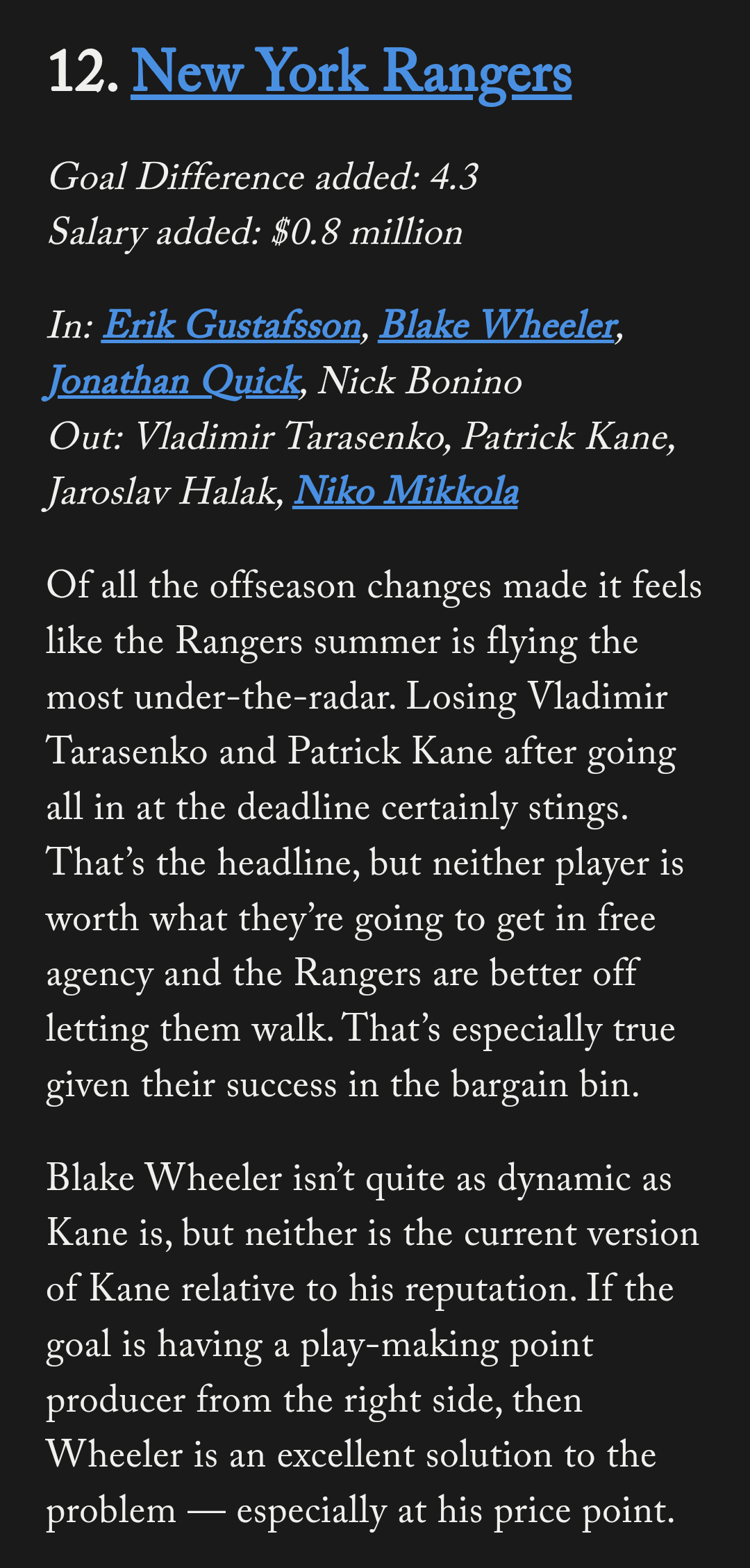 I’m only posting the Rangers bit, which should be okay? [Full article here](https://theathletic.com/4701104/2023/07/19/nhl-offseason-ratings-most-improved-teams).