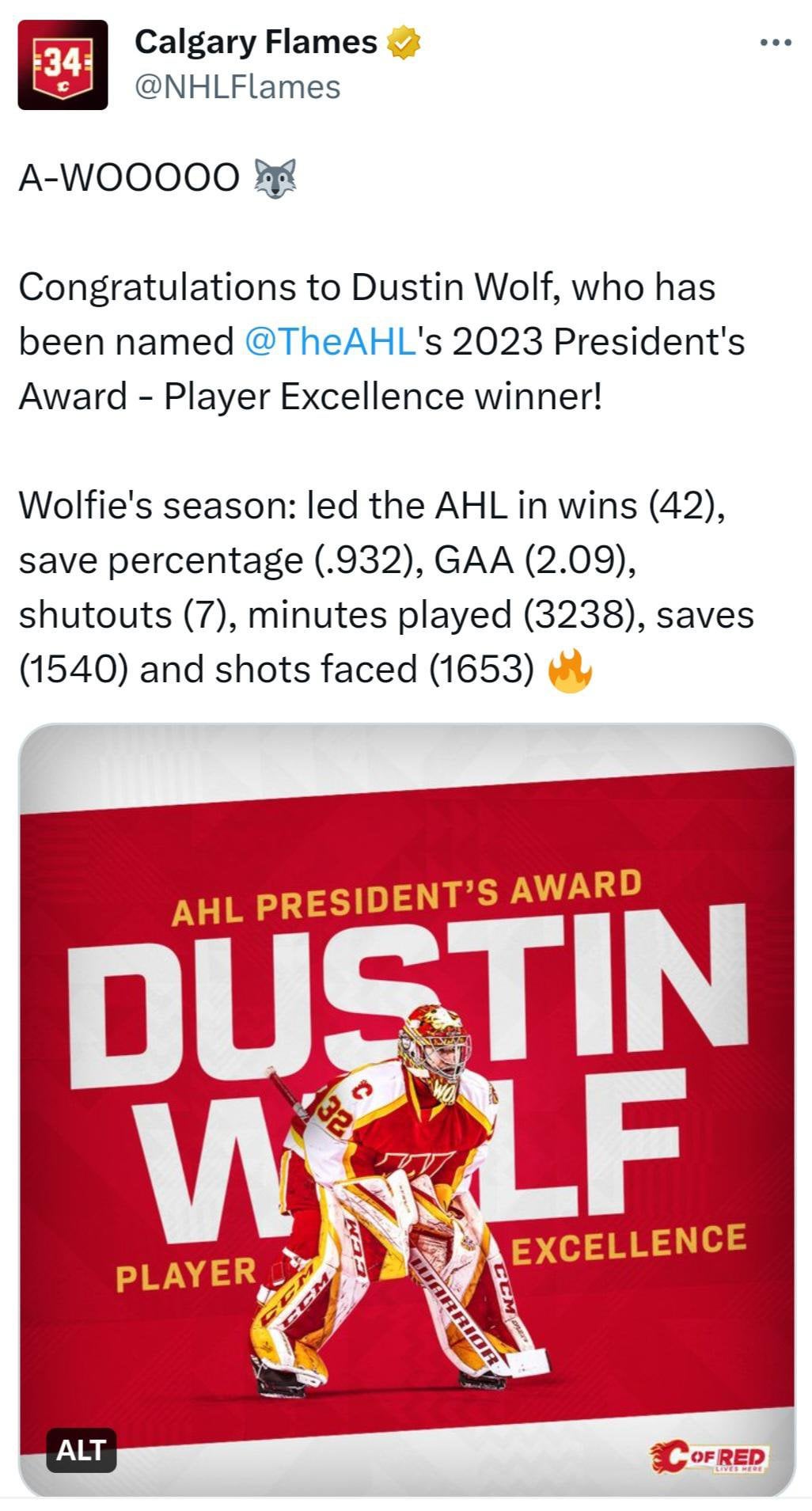 | 195 | [26 comments](/r/CalgaryFlames/comments/155vs3j/dustin_wolf/) | `[AHL]` [Dustin Wolf](https://i.redd.it/52ak0hzb1ddb1.jpg)|