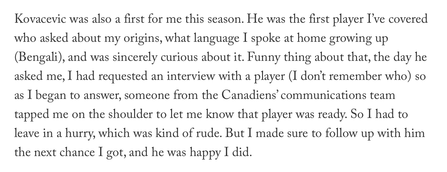 Basu is one of the absolute top journalists coverings the Habs, and seems to be a top human being as well. Very cool to see this story about Kovacevic. He does seem like a great guy as well. It’s not surprising he’s one of the most well-liked players on the team. Here’s from the player poll, published on the Athletic as well: “everyone loves him, everyone loves joking around with him. He’s just unique. He does different things, he’s always smiling and happy”