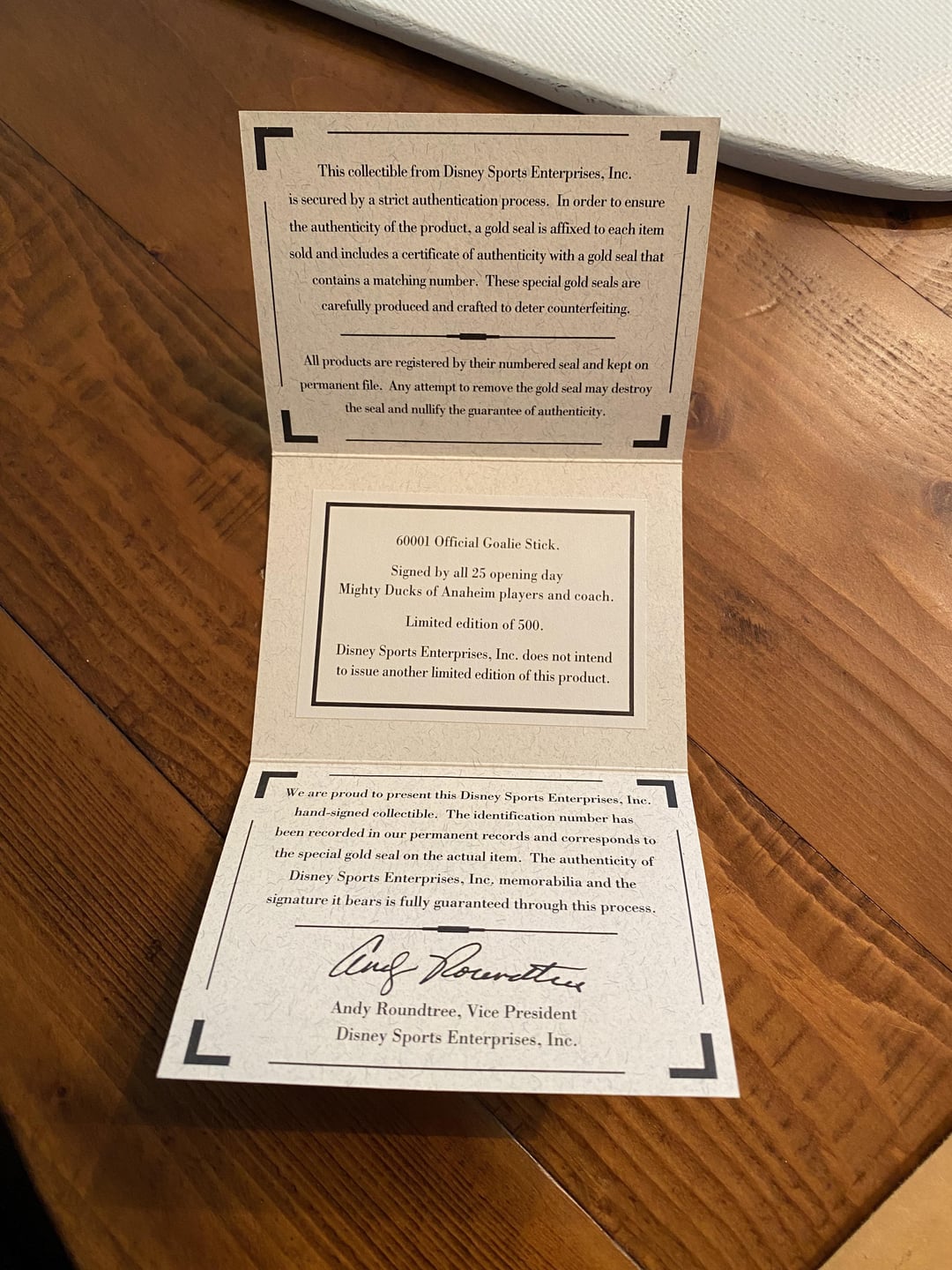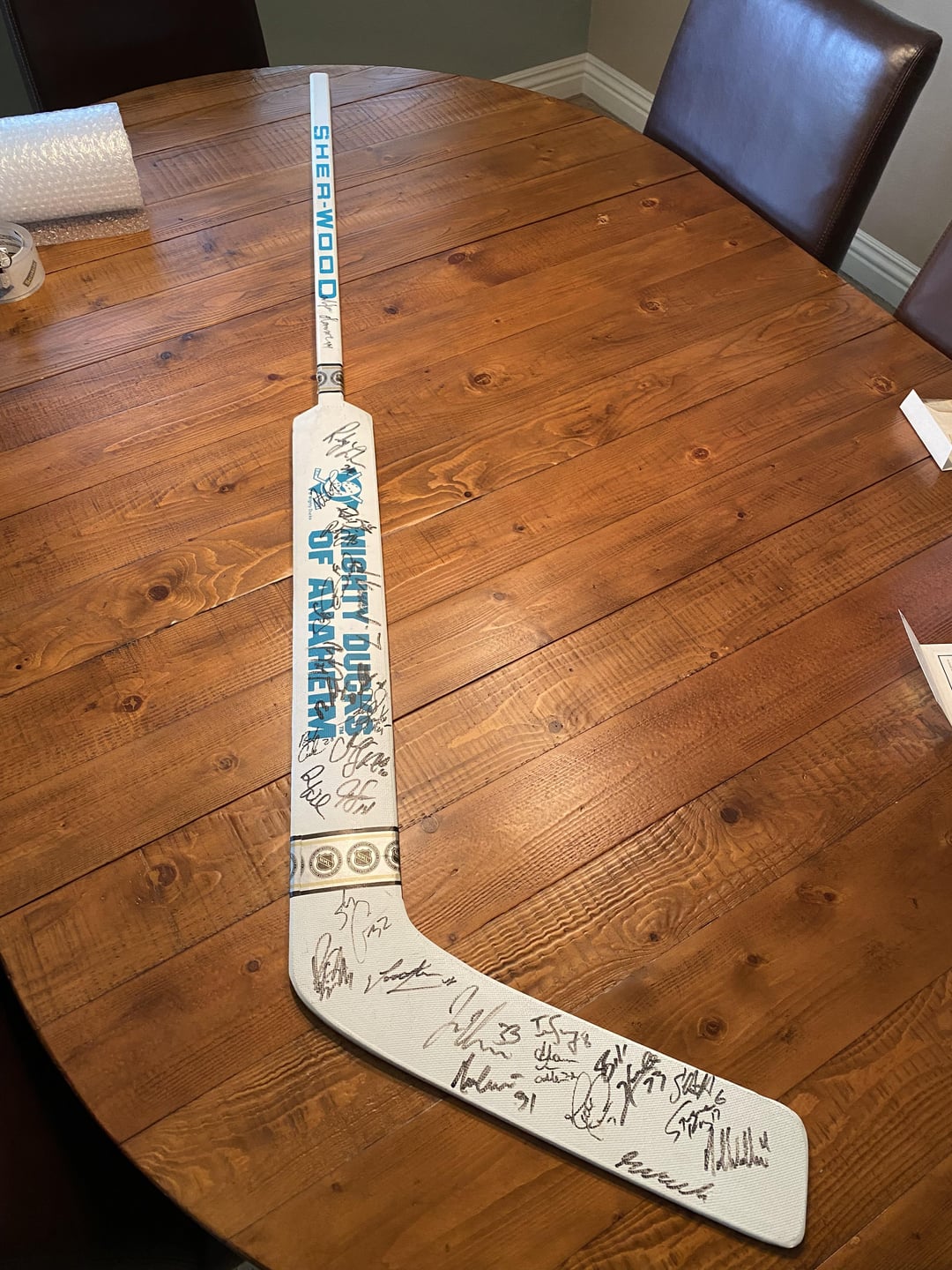 Hey everybody, my Father was an inaugural season ticket holder for the Mighty Ducks in 1993-1994 and he purchased a team-signed goalie stick of the inaugural team. He’s kept it wrapped up for 30 years and we’re wondering what it’s worth, as we can’t find any appraisals anywhere online. It was limited to only 500, and it includes a certificate of authenticity from Disney and it’s hand numbered #77/500.