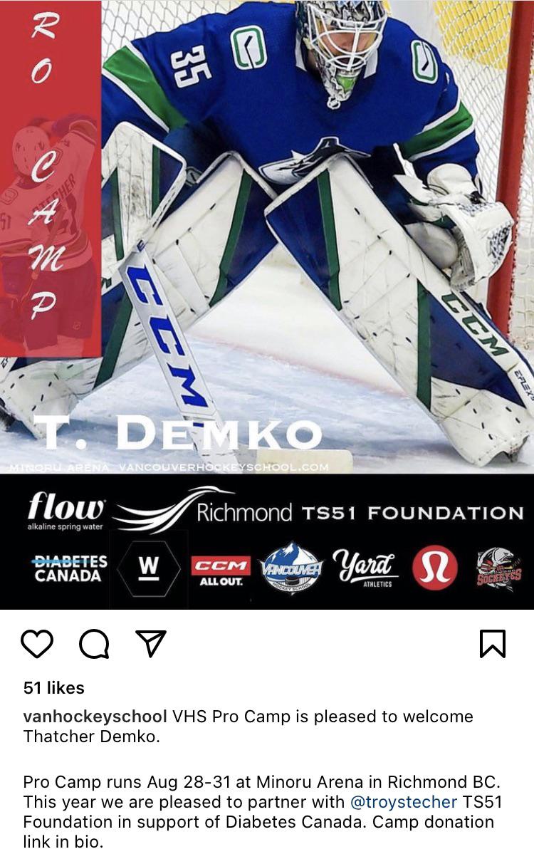 Demko will be at VHS Pro Camp between Aug 28-31 at Minoru Arena in Richmond. For those interested, these sessions are open to the public. Other players attending: Carson Soucy, Kyle Burroughs, Sam Reinhart, Bowen Byram, Brad Hunt.