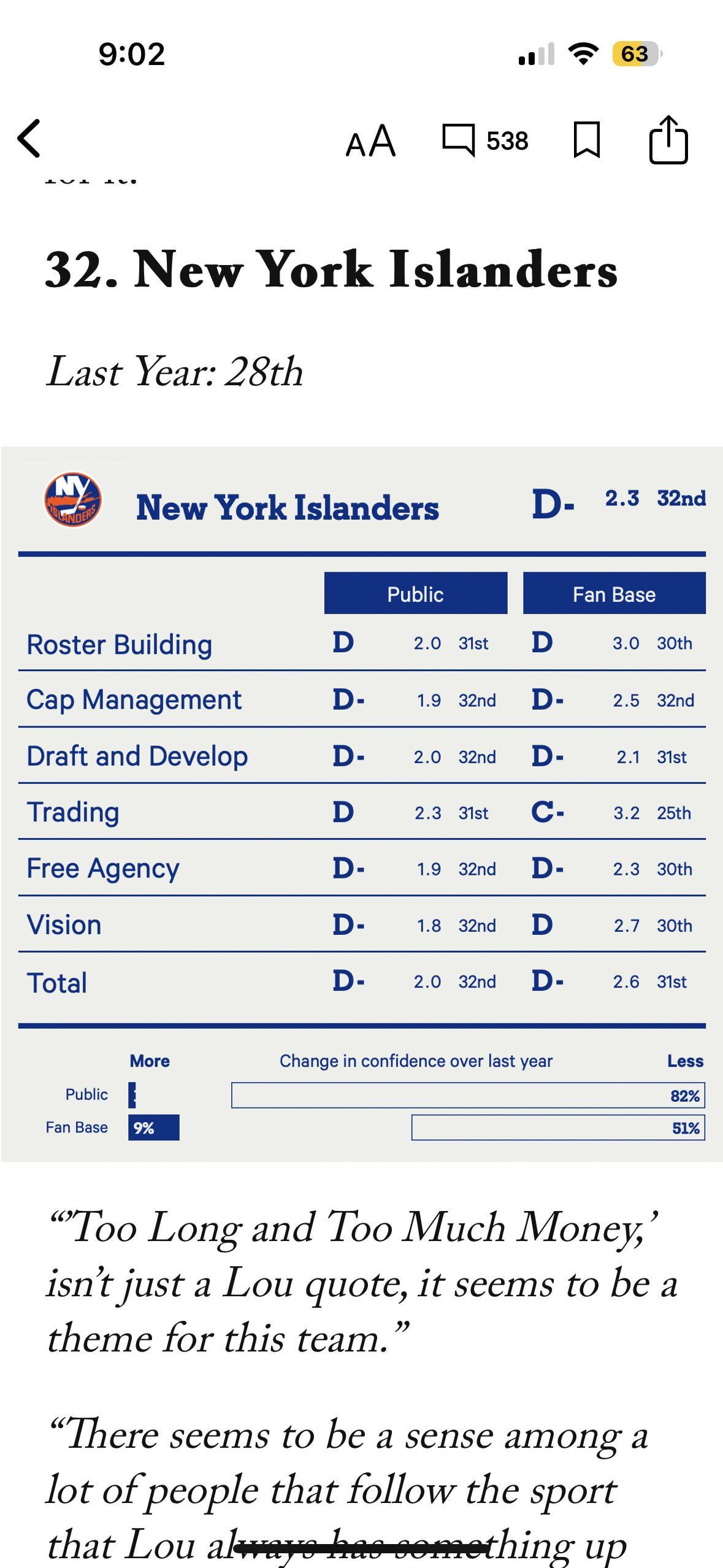 | 102 | [79 comments](/r/NewYorkIslanders/comments/165wonl/the_athletic_releases_their_front_office/) | [The Athletic releases their front office confidence rankings: we’re dead last in the NHL](https://i.redd.it/bmhd1olajclb1.jpg)|