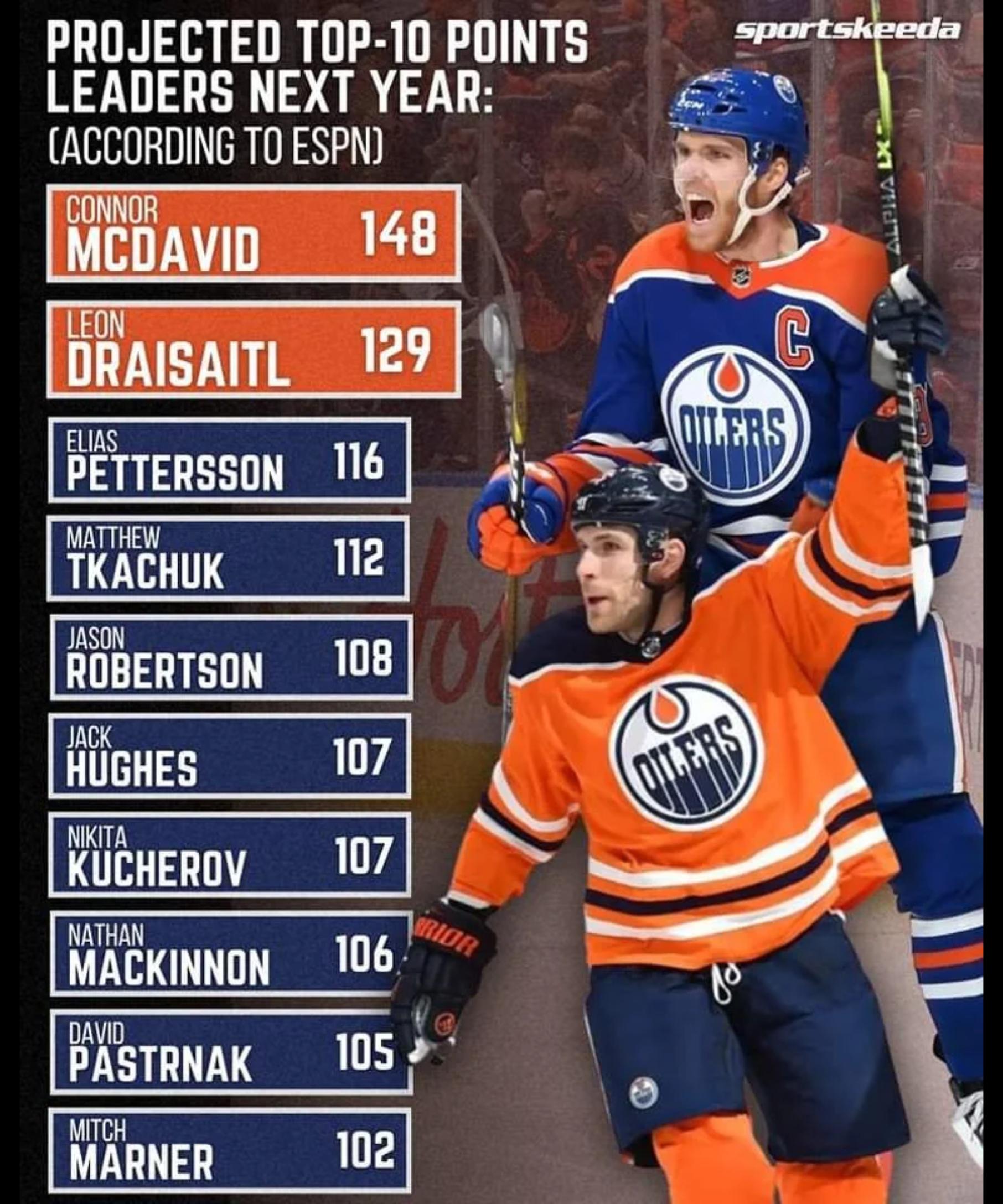Marchand at 46 points while Juraj Slafkovsky, who is returning from an injury, forecasts 22 goals and 55 points in 78 games. Bedard with 90 points…
