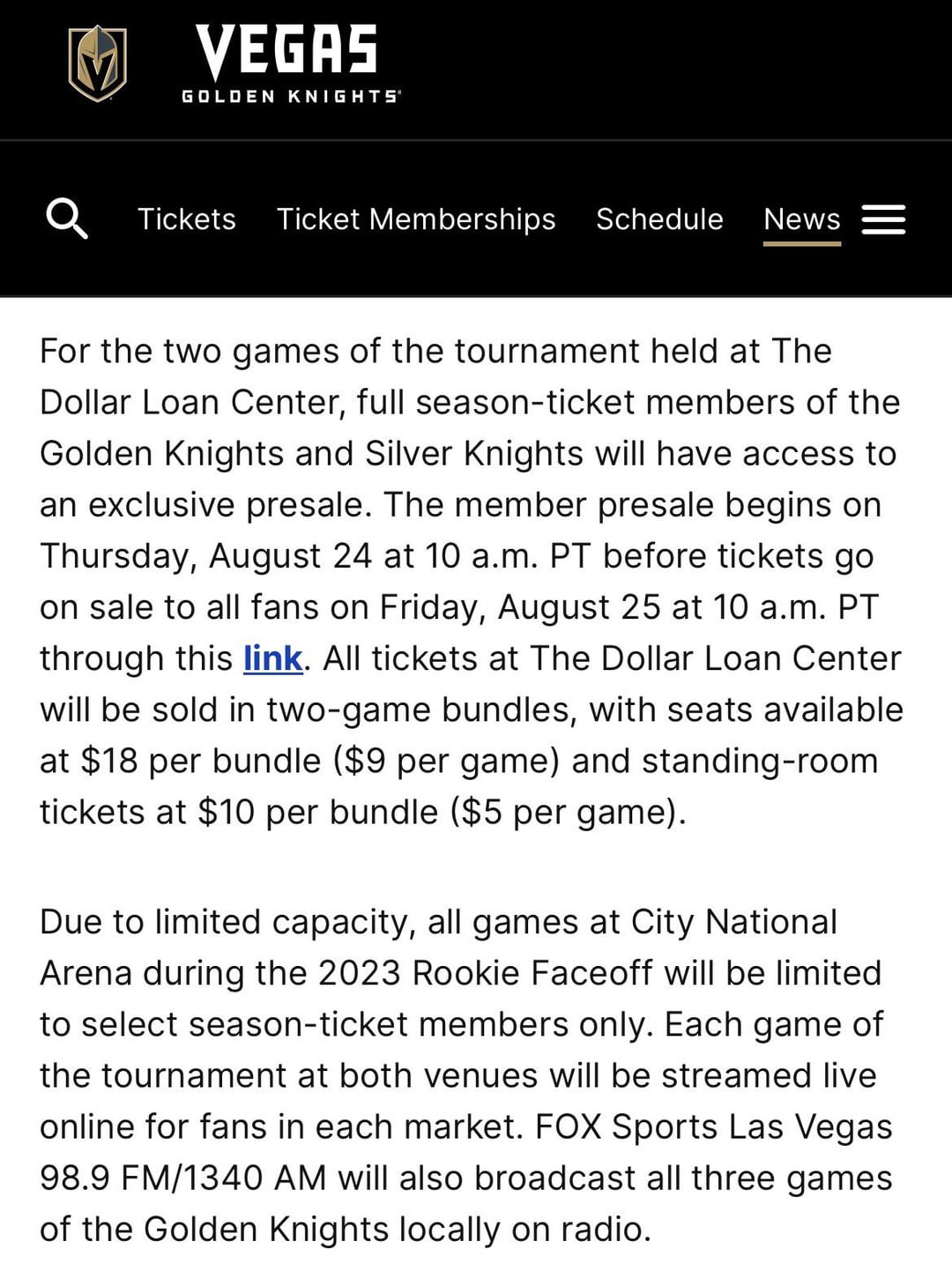 I happen to be in Vegas at the time for a trade show, and looking for some help from the reigning Cup champ’s fans. Haven’t had any luck online, so please DM me if you can help in any way.