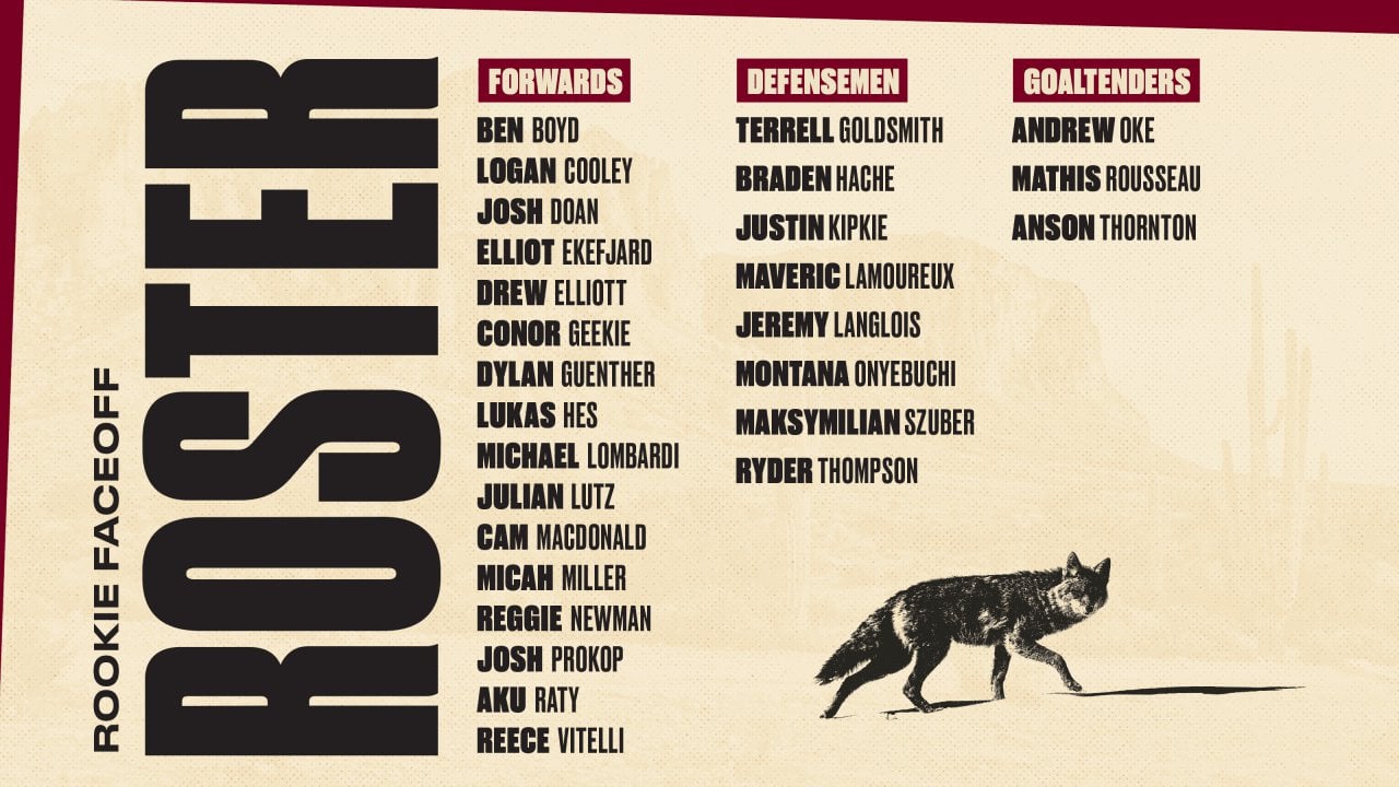 Coyotes Announce 2023 Rookie Faceoff Rosterby 13nobody Arizona CoyotesCentral DivisionWestern Conference Prev Post Penguins Have A Plan For Their Bottom Six September 11, 2023 Next Post 2023-24 Avalanche Predictions: Defensemen edition – Mile High Sports September 11, 2023 1 Comment 13nobody 2 years ago **Forwards:** Ben Boyd, Logan Cooley, Josh Doan, Elliot Ekefjard, Drew Elliott, Conor Geekie, Dylan Guenther, Lukas Hes, Michael Lombardi, Julian Lutz, Cam MacDonald, Micah Miller, Reggie Newman, Josh Prokop, Aku Raty, Reece Vitelli**Defensemen:** Terrell Goldsmith, Braden Hache, Justin Kipkie, Maveric Lamoureux, Jeremy Langlois, Montana Onyebuchi, Maksymilian Szuber, Ryder Thompson**Goaltenders:** Andrew Oke, Mathis Rousseau, Anson ThorntonWrite A CommentYou must be logged in to post a comment.
