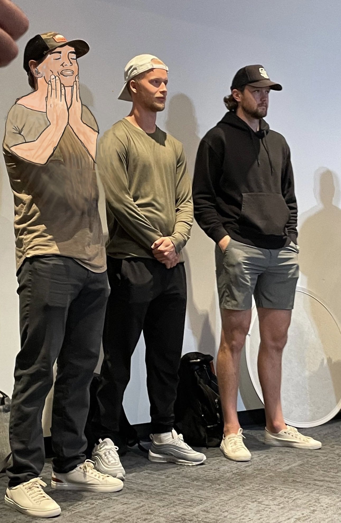 I just noticed I can see the complete outline of Demko’s hands in his pockets and it is strange.