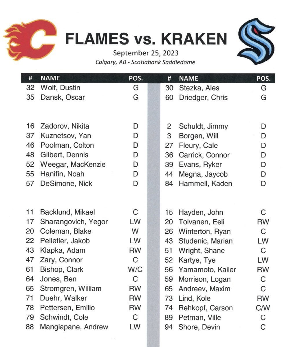 Here are rosters for tonight’s #Flames and #SeaKraken split squad games.